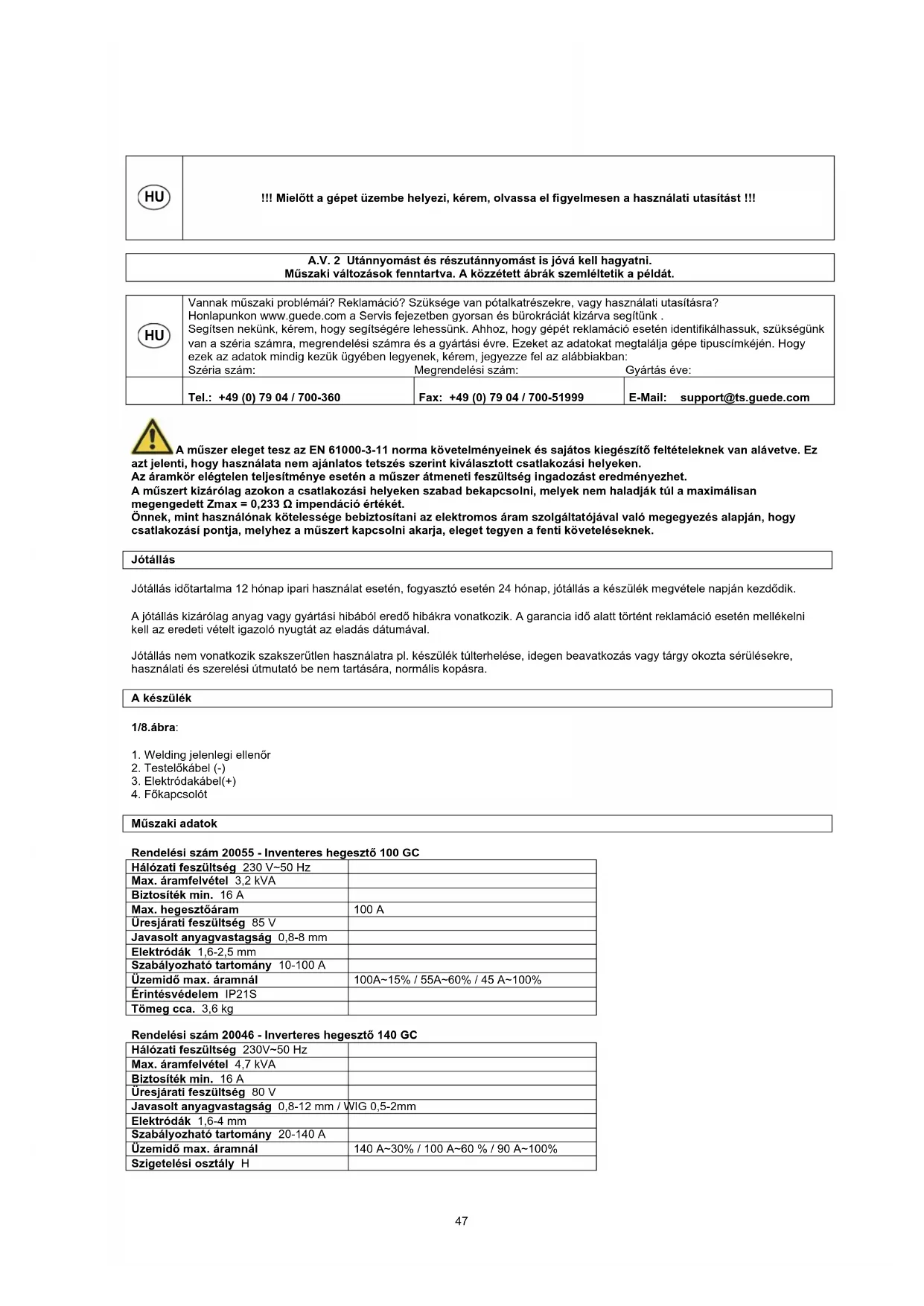 Tel.: +49 (0) 79 04 / 700-360 Fax: +49 (0) 79 04 / 700-51999 E-Mail: support@ts.guede.com 47Érintésvédelem IP21S Tömeg cca. 6 kg Rendelési szám 20047 - Inverteres hegesztő 160 GC Hálózati feszültség 230 V~50 Hz Max. áramfelvétel 5,6 kVA Biztosíték min. 16 A Üresjárati feszültség 80 V Javasolt anyagvastagság 0,8-15 mm / WIG 0,5-2 mm Elektródák 1,6-4 mm Szabályozható tartomány 20-160 A Üzemidő max. áramnál 160 A~20 % / 100 A~60 % / 90 A~100 % Szigetelési osztály H Érintésvédelem IP21S Tömeg cca. 7 kg Általános biztonsági előírások A készülék első bekapcsolása előtt fontos a teljes használati utasítás elolvasása. Amennyiben a készülék csatlakoztatásával és használatával kapcsolatosan kérdések merülnének fel, forduljon a gyártóhoz vagy az illetékes vevőszolgálathoz. A készüléket védje nedvesség, eső és por ellen! A NAGYFOKÚ BIZTONSÁG BETARTÁSA ÉRDEKÉBEN GONDOSAN ÜGYELJEN AZ ALÁBBI ELŐÍRÁSOK BETARTÁSÁRA: A felhasználó felelős a készülék gyártó előírásainak megfelelő szakszerű üzembehelyezéséért és használatáért. Ha a felhasználó elektromágneses zavarokat észlel, felel ezek elhárításáért a gyártó műszaki segítségével. Sok esetben a probléma elhárításához elegendő a hegesztési környezet elektromos leföldelése. Más esetben szükségessé válhat elektromágneses árnyékolás kialakítása, amely feszültségszűrő rákötésével leárnyékolja az áramforrást és az egész munkaterületet. Mindenesetre az elektromágneses meghibásodásokat olyan mértékben kell elhárítani, hogy a felhasználó számára már ne legyenek zavaróak. Figyelem: Biztonsági okokból az áramkört nem szabad leföldelni. A készülék biztonsági előírásaival kapcsolatban történő változtatásokat csak hozzáértő, feljogosított személyek végezhetnek, akik tisztában vannak a módosítások esetleges következményeivel és kockázatával. A munka környezetére vonatkozó követelmények A készülék üzembehelyezése és használatba vétele előtt a felhasználónak mérlegelnie kell a felmerülhető elektromágneses zavarok környezetre való kihatását. A következőkre kell figyelemmel lenni: a) egyéb hálózati, ellenőrző, jelző- és telefonkábelek a hegesztőkészülék felett vagy alatt, vagy annak közvetlen környezetében vezetve; b) rádió- és televíziókészülékek, vevőkészülékek; c) számítógépek és egyéb ellenőrző berendezések; d) biztonsági és jelző-figyelő berendezések; e) a jelenlévő személyek egészségi állapota, pl. kardiostimulátorok, nagyothalló készülékek stb. f) hitelesítésre szolgáló mérőberendezések; g) a hegesztőkészülék közelében lévő egyéb műszerek. Biztosítani kell, hogy ezen berendezések kompatibilisek legyenek. Védelmük érdekében további kiegészítő intézkedések válhatnak szükségessé; h) a hegesztési vagy egyéb munka idejének napi beosztása. A hegesztési munka által befolyásolt munkaterület nagysága függ az épület struktúrájától és az egyidejűleg végzett egyéb tevékenységek mértékétől. Ez a terület kiterjedhet egészen a szomszédos épületekig. Emissziócsökkentés Bejövő áramellátás A hegesztőkészüléket a gyártó útmutatása szerint kell közvetlenül a hálózatba bekötni. Amennyiben meghibásodás következik be, további intézkedésre lehet szükség, pl. szűrő alkalmazására a bejövő áramellátásnál. A fixen elhelyezett hegesztőkészülék áramellátására szolgáló kábelt egy szigetelt csőben kell elhelyezni, a kábel teljes hosszúságában. A hegesztőkábelek lehetőség szerint a legrövidebbek legyenek. Speciális biztonsági előírások Bevezetés Az ívhegesztő készülékek a hegesztés területén szerzett sokéves tapasztalatok alapján lettek kifejlesztve. A gyártó által előírt kezelési útmutatások betartása esetén magasfokú működési megbízhatóságot és nagyon jó hegesztési minőséget lehet segítségükkel elérni. Ezért a munkavezetőnek biztosítani kell, hogy ezen kezelési információkat mindenki elolvashassa, aki ilyen készülékkel dolgozik.