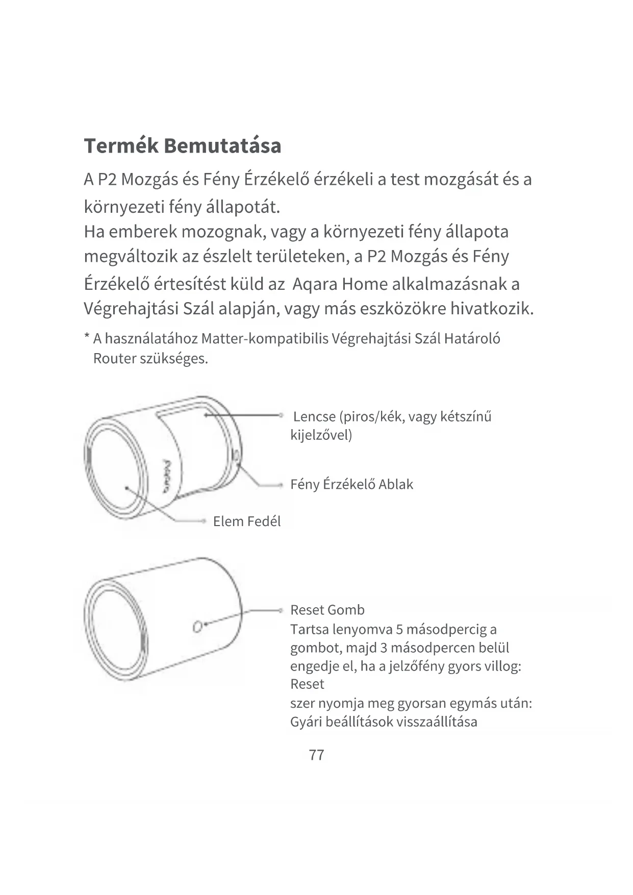 - A használatához Matter-kompatibilis Végrehajtási Szál Határoló Router szükséges. A P2 Mozgás és Fény Érzékelő érzékeli a test mozgását és a környezeti fény állapotát. Ha emberek mozognak, vagy a környezeti fény állapota megváltozik az észlelt területeken, a P2 Mozgás és Fény Érzékelő értesítést küld az Aqara Home alkalmazásnak a Végrehajtási Szál alapján, vagy más eszközökre hivatkozik. Termék Bemutatása Reset Gomb Tartsa lenyomva 5 másodpercig a gombot, majd 3 másodpercen belül engedje el, ha a jelzőfény gyors villog: Reset szer nyomja meg gyorsan egymás után: Gyári beállítások visszaállítása Lencse (piros/kék, vagy kétszínű kijelzővel) Fény Érzékelő Ablak Elem Fedél78 1.Győződjön meg róla, hogy rendelkezik Matter-kompatibilis alkalmazással és Matter-kompatibilis Végrehajtási Szál Határoló Routerrel.