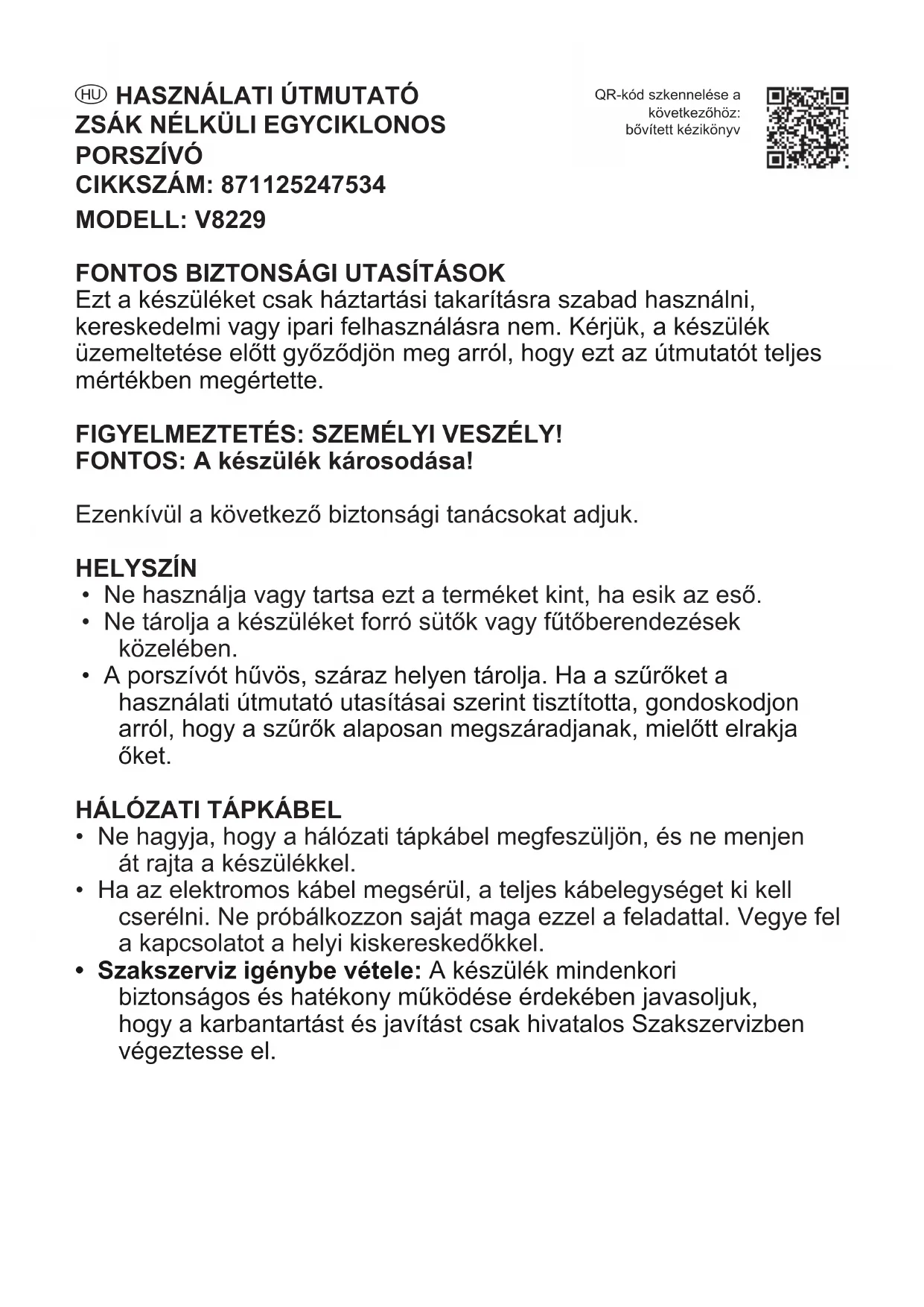 - Szakszerviz igénybe vétele: A készülék mindenkori biztonságos és hatékony működése érdekében javasoljuk, hogy a karbantartást és javítást csak hivatalos Szakszervizben végeztesse el. QR-kód szkennelése a következőhöz: bővített kézikönyvGYERMEKEK