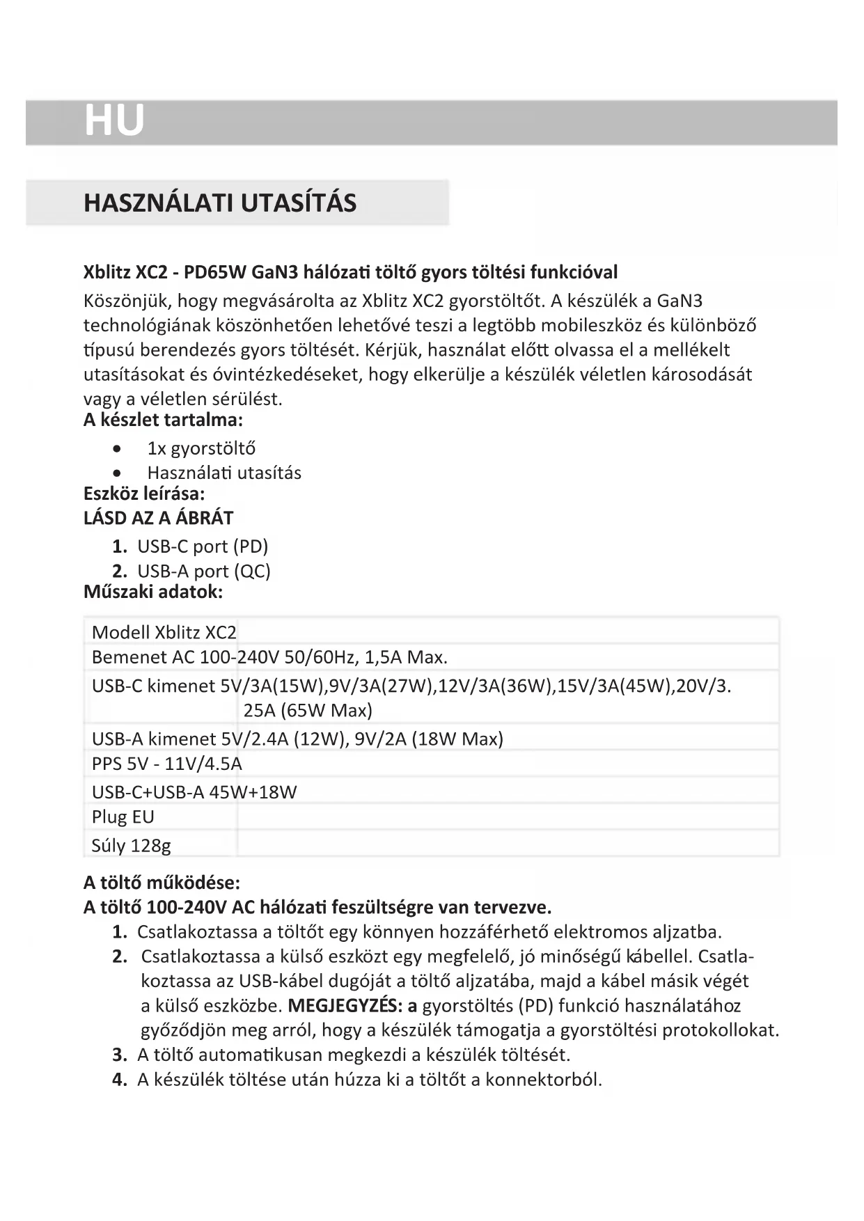 Xblitz XC2 - PD65W GaN3 hálóza töltő gyors töltési funkcióval Köszönjük, hogy megvásárolta az Xblitz XC2 gyorstöltőt. A készülék a GaN3 technológiának köszönhetően lehetővé teszi a legtöbb mobileszköz és különböző pusú berendezés gyors töltését. Kérjük, használat elő olvassa el a mellékelt utasításokat és óvintézkedéseket, hogy elkerülje a készülék véletlen károsodását vagy a véletlen sérülést. A készlet tartalma: