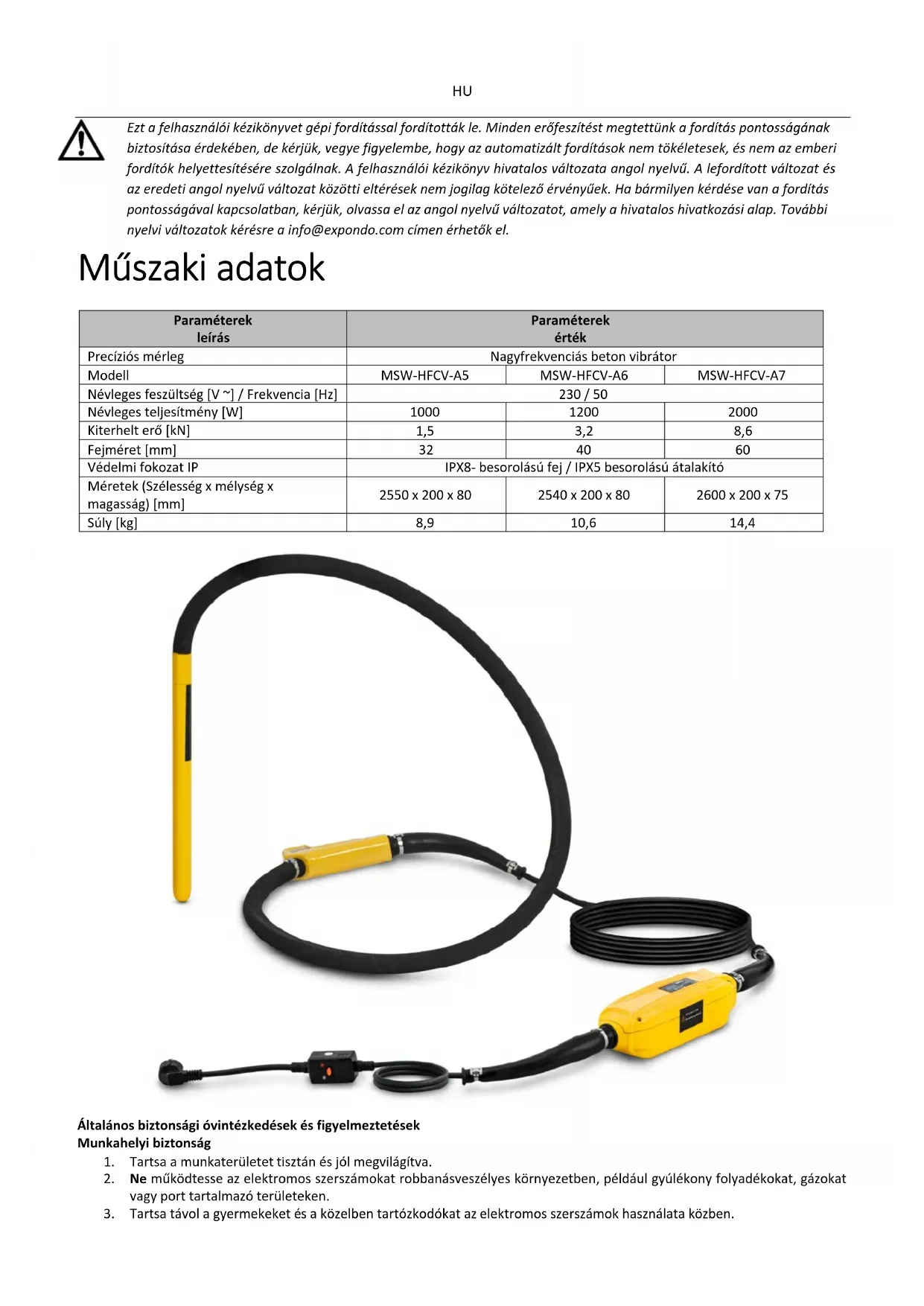 Ezt a felhasználói kézikönyvet gépi fordítással fordították le. Minden erőfeszítést megtettünk a fordítás pontosságának biztosítása érdekében, de kérjük, vegye figyelembe, hogy az automatizált fordítások nem tökéletesek, és nem az emberi fordítók helyettesítésére szolgálnak. A felhasználói kézikönyv hivatalos változata angol nyelvű. A lefordított változat és az eredeti angol nyelvű változat közötti eltérések nem jogilag kötelező érvényűek. Ha bármilyen kérdése van a fordítás pontosságával kapcsolatban, kérjük, olvassa el az angol nyelvű változatot, amely a hivatalos hivatkozási alap. További nyelvi változatok kérésre a info@expondo.com címen érhetők el. Műszaki adatok Paraméterek leírás Paraméterek érték Precíziós mérleg Nagyfrekvenciás beton vibrátor Modell MSW-HFCV-A5 MSW-HFCV-A6 MSW-HFCV-A7 Névleges feszültség [V ~] / Frekvencia [Hz] 230 / 50 Névleges teljesítmény [W]