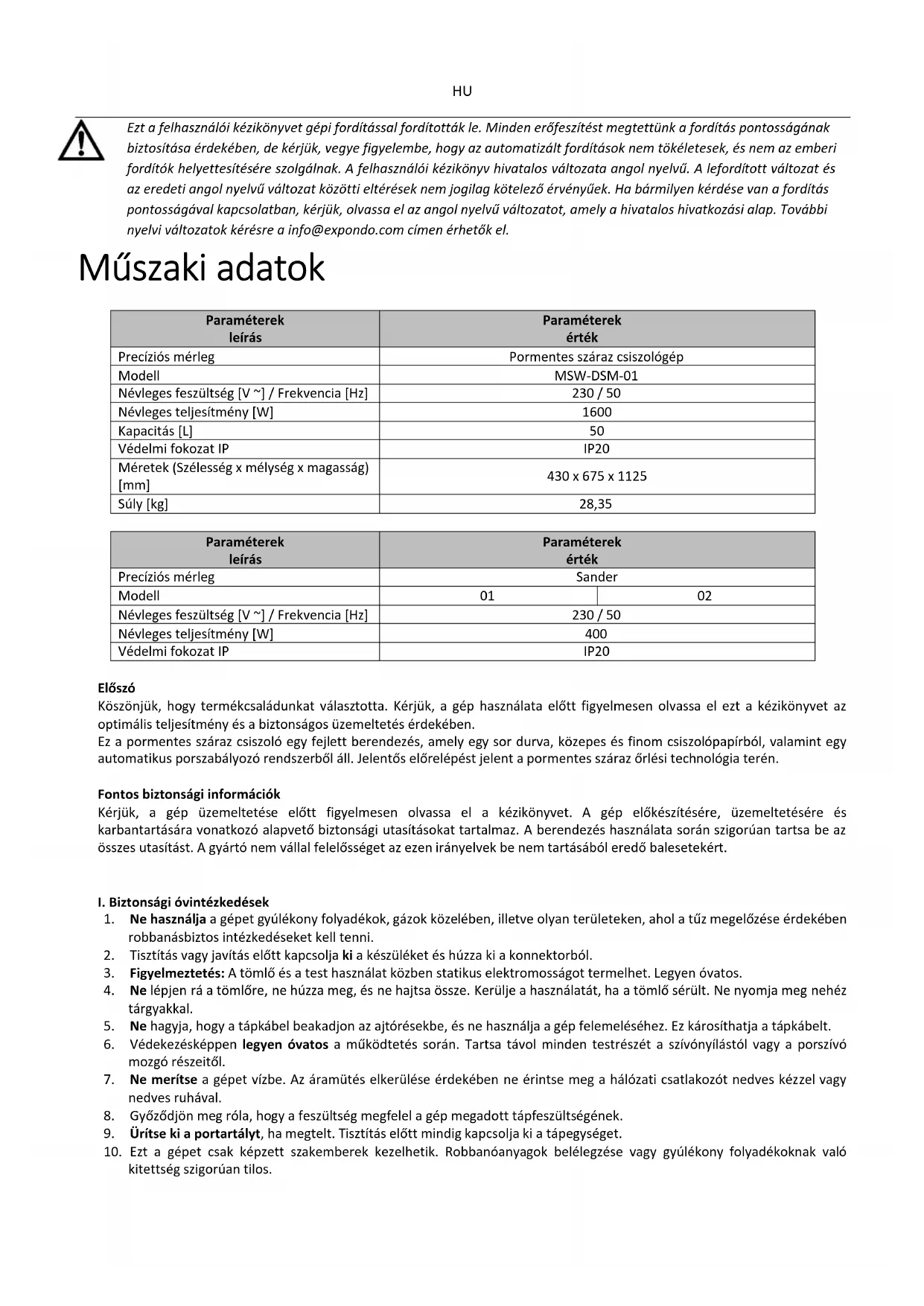Ezt a felhasználói kézikönyvet gépi fordítással fordították le. Minden erőfeszítést megtettünk a fordítás pontosságának biztosítása érdekében, de kérjük, vegye figyelembe, hogy az automatizált fordítások nem tökéletesek, és nem az emberi fordítók helyettesítésére szolgálnak. A felhasználói kézikönyv hivatalos változata angol nyelvű. A lefordított változat és az eredeti angol nyelvű változat közötti eltérések nem jogilag kötelező érvényűek. Ha bármilyen kérdése van a fordítás pontosságával kapcsolatban, kérjük, olvassa el az angol nyelvű változatot, amely a hivatalos hivatkozási alap. További nyelvi változatok kérésre a info@expondo.com címen érhetők el. Műszaki adatok Paraméterek leírás Paraméterek érték Precíziós mérleg Pormentes száraz csiszológép Modell MSW-DSM-01 Névleges feszültség [V ~] / Frekvencia [Hz] 230 / 50 Névleges teljesítmény [W]