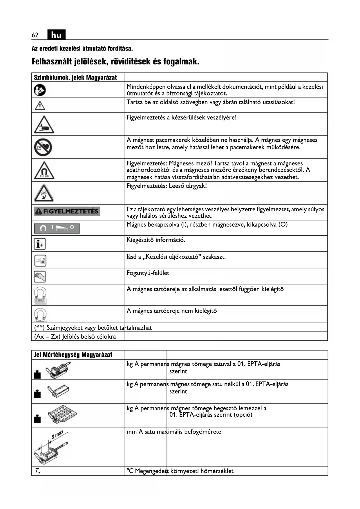 Az eredeti kezelési útmutató fordítása. Felhasznált jelölések, rövidítések és fogalmak. Szimbólumok, jelek Magyarázat Mindenképpen olvassa el a mellékelt dokumentációt, mint például a kezelési útmutatót és a biztonsági tájékoztatót. Tartsa be az oldalsó szövegben vagy ábrán található utasításokat! Figyelmeztetés a kézsérülések veszélyére! A mágnest pacemakerek közelében ne használja. A mágnes egy mágneses mezőt hoz létre, amely hatással lehet a pacemakerek működésére. Figyelmeztetés: Mágneses mező! Tartsa távol a mágnest a mágneses adathordozóktól és a mágneses mezőre érzékeny berendezésektől. A mágnesek hatása visszafordíthatalan adatveszteségekhez vezethet. Figyelmeztetés: Leeső tárgyak! Ez a tájékozató egy lehetséges veszélyes helyzetre figyelmeztet, amely súlyos vagy halálos sérüléshez vezethet. Mágnes bekapcsolva (I), részben mágnesezve, kikapcsolva (O) Kiegészítő információ. lásd a „Kezelési tájékoztató” szakaszt. Fogantyú-felület A mágnes tartóereje az alkalmazási esettől függően kielégítő A mágnes tartóereje nem kielégítő (**) Számjegyeket vagy betűket tartalmazhat (Ax – Zx) Jelölés belső célokra Jel Mértékegység Magyarázat kg A permanens mágnes tömege satuval a 01. EPTA-eljárás szerint kg A permanens mágnes tömege satu nélkül a 01. EPTA-eljárás szerint kg A permanens mágnes tömege hegesztő lemezzel a