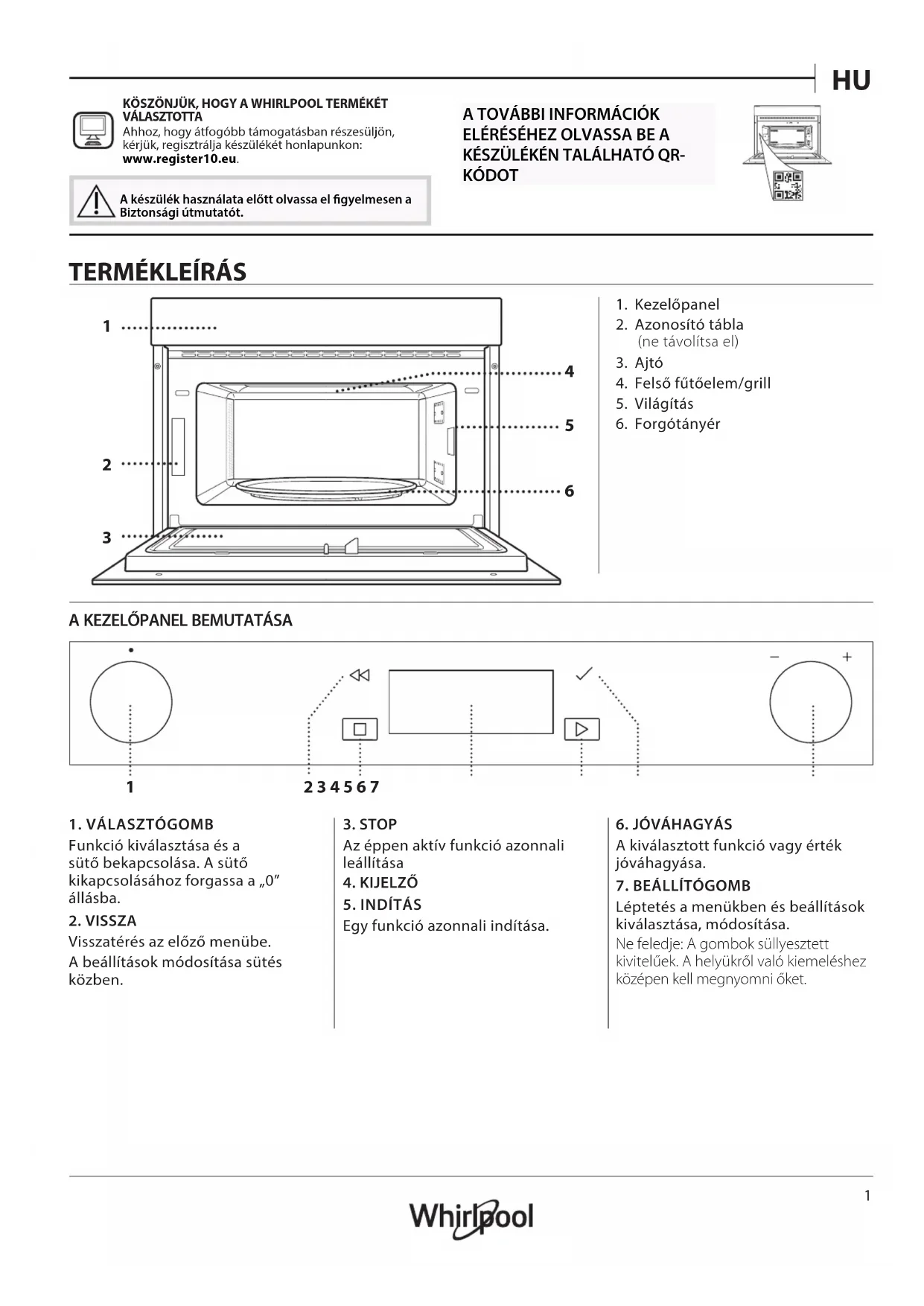 KÖSZÖNJÜK, HOGY A WHIRLPOOL TERMÉKÉT VÁLASZTOTTA Ahhoz, hogy átfogóbb támogatásban részesüljön, kérjük, regisztrálja készülékét honlapunkon: www.register10.eu. A készülék használata előtt olvassa el gyelmesen a Biztonsági útmutatót.