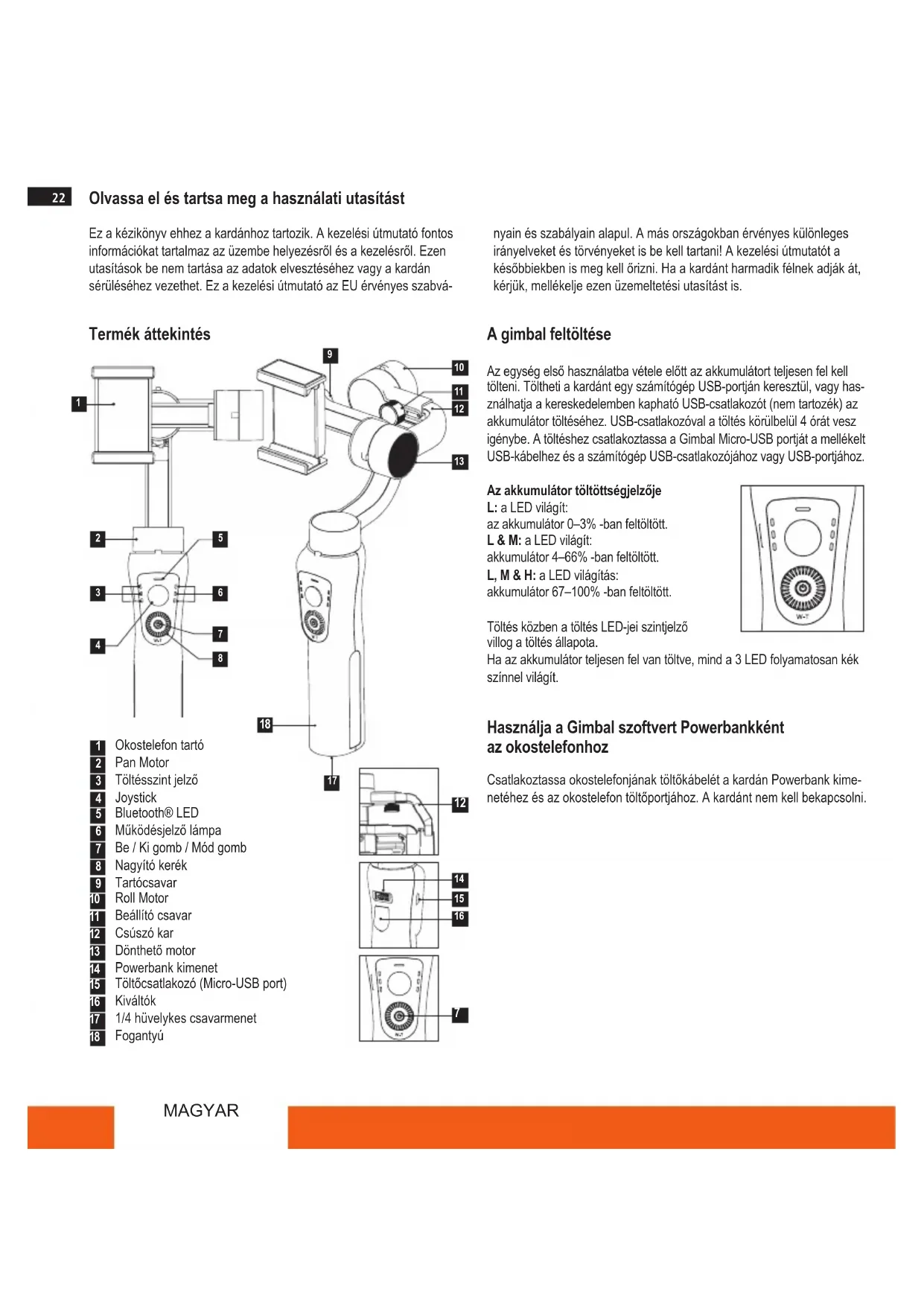 - Prima di smaltire il dispositivo è necessario rimuovere la batteria, per poi smaltirla separatamente. Attenzione: La batteria non può essere sostituita autonomamente! Conformità Con la presente Rollei GmbH & Co. KG, che è conforme al sistema cardanico „Rollei Steady Butler Mobile 4“ della direttiva 2014/53/UE. Direttiva RoHS 2011/65/CE Direttiva 2014/53/UE ROSSO Il testo integrale della dichiarazione di conformità UE è disponibile al seguente indirizzo Internet: www.rollei.com/egk/steadybutler4 Smaltimento Smaltire l’imballaggio: Smaltire l’imballaggio a seconda della tipologia. Gettare cartone e cartoncino con i rifiuti cartacei, le pellicole con i materiali riciclabili. Smaltimento di dispositivi elettrici ed elettronici usati e/o di batterie/accumulatori da parte di utenti domestici all’interno dell’Unione Europea. Questo simbolo, qualora riportato sul prodotto o sulla sua confezione, segnala che il prodotto non può essere smaltito con i rifiuti domestici. È necessario consegnare il proprio dispositivo usato e/o batterie/accumulatori nei punti di raccolta espressamente designati per il riciclo di dispositivi elettrici ed elettronici e/o batterie e accumulatori. È possibile ottenere ulteriori informazioni sul riciclo di questi dispositivi e/o delle batterie/accumulatori presso la propria amministrazione comunali, presso l’ufficio in cui è stato acquistato il dispositivo o presso la rispettiva attività di smaltimento. Il riciclo dei materiali contribuisce alla protezione delle risorse naturali e garantisce una modalità di riutilizzo sicura per la salute umana e per l’ambiente. Le batterie e le batterie ricaricabili non devono essere smaltite insieme ai rifiuti domestici! In qualità di consumatore, siete obbligati per legge a smaltire tutte le pile e gli accumulatori, che contengano o meno sostanze nocive*, presso un punto di raccolta nel vostro comune/distretto o nel commercio, in modo che possano essere smaltiti nel rispetto dell‘ambiente. *contrassegnato con Cd = cadmio, Hg = mercurio, Pb = piombo22 MAGYAR A gimbal feltöltése Az egység első használatba vétele előtt az akkumulátort teljesen fel kell tölteni. Töltheti a kardánt egy számítógép USB-portján keresztül, vagy has- ználhatja a kereskedelemben kapható USB-csatlakozót (nem tartozék) az akkumulátor töltéséhez. USB-csatlakozóval a töltés körülbelül 4 órát vesz igénybe. A töltéshez csatlakoztassa a Gimbal Micro-USB portját a mellékelt USB-kábelhez és a számítógép USB-csatlakozójához vagy USB-portjához. Az akkumulátor töltöttségjelzője L: a LED világít: az akkumulátor 0–3% -ban feltöltött. L & M: a LED világít: akkumulátor 4–66% -ban feltöltött. L, M & H: a LED világítás: akkumulátor 67–100% -ban feltöltött. Töltés közben a töltés LED-jei szintjelző villog a töltés állapota. Ha az akkumulátor teljesen fel van töltve, mind a 3 LED folyamatosan kék színnel világít. Használja a Gimbal szoftvert Powerbankként az okostelefonhoz Csatlakoztassa okostelefonjának töltőkábelét a kardán Powerbank kime- netéhez és az okostelefon töltőportjához. A kardánt nem kell bekapcsolni. Olvassa el és tartsa meg a használati utasítást Ez a kézikönyv ehhez a kardánhoz tartozik. A kezelési útmutató fontos információkat tartalmaz az üzembe helyezésről és a kezelésről. Ezen utasítások be nem tartása az adatok elvesztéséhez vagy a kardán sérüléséhez vezethet. Ez a kezelési útmutató az EU érvényes szabvá- nyain és szabályain alapul. A más országokban érvényes különleges irányelveket és törvényeket is be kell tartani! A kezelési útmutatót a későbbiekben is meg kell őrizni. Ha a kardánt harmadik félnek adják át, kérjük, mellékelje ezen üzemeltetési utasítást is. Termék áttekintés