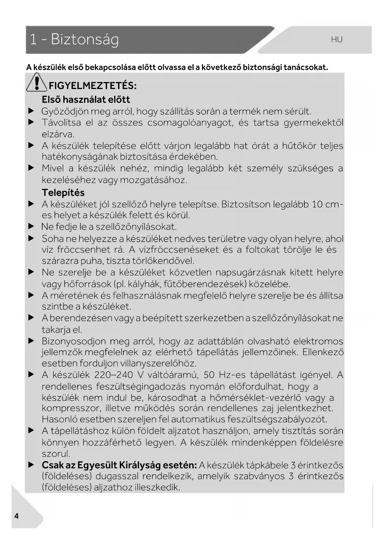 A készülék első bekapcsolása előtt olvassa el a következő biztonsági tanácsokat. FIGYELMEZTETÉS: Első használat előtt Győződjön meg arról, hogy szállítás során a termék nem sérült. Távolítsa el az összes csomagolóanyagot, és tartsa gyermekektől elzárva. A készülék telepítése előtt várjon legalább hat órát a hűtőkör teljes hatékonyságának biztosítása érdekében. Mivel a készülék nehéz, mindig legalább két személy szükséges a kezeléséhez vagy mozgatásához. Telepítés A készüléket jól szellőző helyre telepítse. Biztosítson legalább 10 cm- es helyet a készülék felett és körül. Ne fedje le a szellőzőnyílásokat. Soha ne helyezze a készüléket nedves területre vagy olyan helyre, ahol víz fröccsenhet rá. A vízfröccsenéseket és a foltokat törölje le és szárazra puha, tiszta törlőkendővel. Ne szerelje be a készüléket közvetlen napsugárzásnak kitett helyre vagy hőforrások (pl. kályhák, fűtőberendezések) közelébe. A méretének és felhasználásnak megfelelő helyre szerelje be és állítsa szintbe a készüléket. A berendezésen vagy a beépített szerkezetben a szellőzőnyílásokat ne takarja el. Bizonyosodjon meg arról, hogy az adattáblán olvasható elektromos jellemzők megfelelnek az elérhető tápellátás jellemzőinek. Ellenkező esetben forduljon villanyszerelőhöz. A készülék 220–240 V váltóáramú, 50 Hz-es tápellátást igényel. A rendellenes feszültségingadozás nyomán előfordulhat, hogy a készülék nem indul be, károsodhat a hőmérséklet-vezérlő vagy a kompresszor, illetve működés során rendellenes zaj jelentkezhet. Hasonló esetben szereljen fel automatikus feszültségszabályozót. A tápellátáshoz külön földelt aljzatot használjon, amely tisztítás során könnyen hozzáférhető legyen. A készülék mindenképpen földelésre szorul. Csak az Egyesült Királyság esetén: A készülék tápkábele 3 érintkezős (földeléses) dugasszal rendelkezik, amelyik szabványos 3 érintkezős (földeléses) aljzathoz illeszkedik.1 - Biztonság