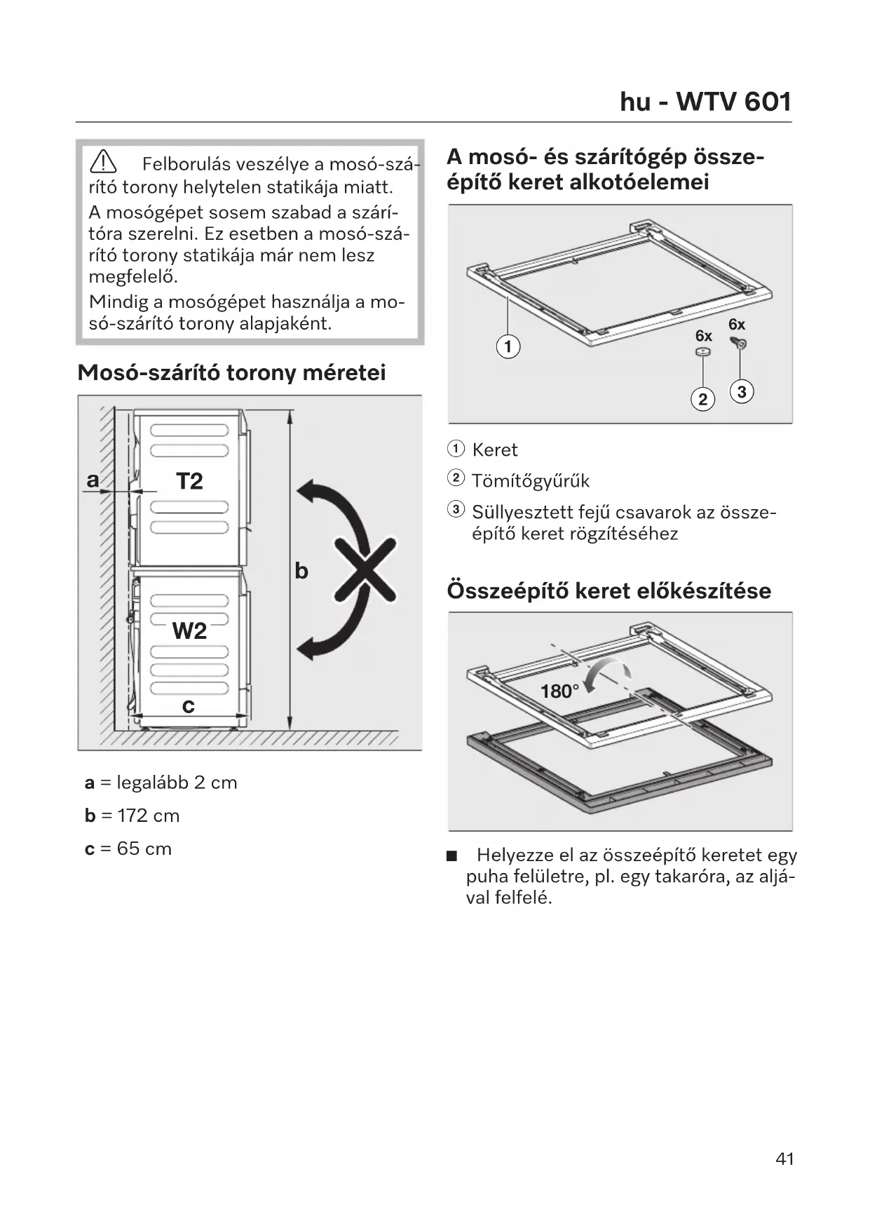 a = legalább 2cm b = 172cm c = 65cm A mosó- és szárítógép össze- építő keret alkotóelemei