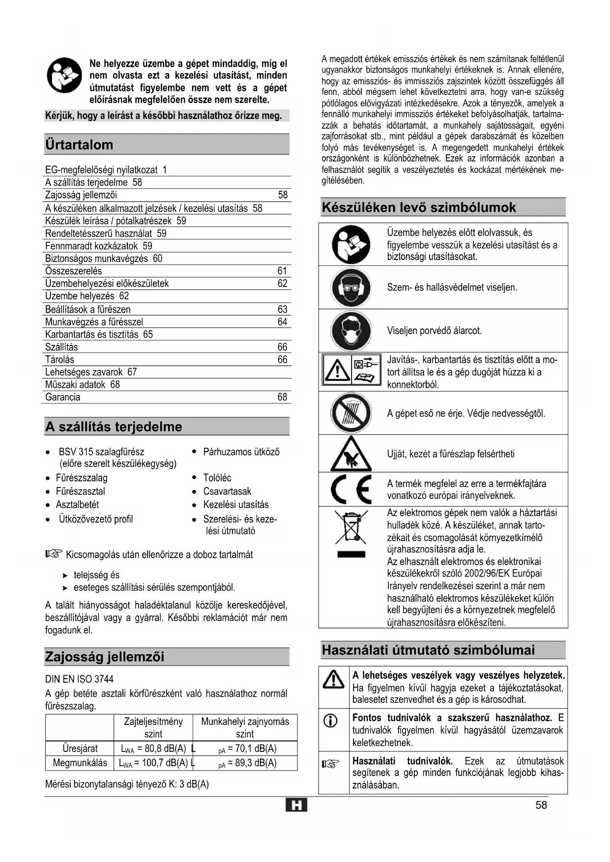Garanti Se venligst vedlagte garantierklæring.58 Ne helyezze üzembe a gépet mindaddig, míg el nem olvasta ezt a kezelési utasítást, minden útmutatást figyelembe nem vett és a gépet előírásnak megfelelően össze nem szerelte. Kérjük, hogy a leírást a későbbi használathoz őrizze meg. Űrtartalom EG-megfelelőségi nyilatkozat 1 A szállítás terjedelme 58 Zajosság jellemzői 58 A készüléken alkalmazott jelzések / kezelési utasítás 58 Készülék leírása / pótalkatrészek 59 Rendeltetésszerű használat 59 Fennmaradt kozkázatok 59 Biztonságos munkavégzés 60 Összeszerelés 61 Üzembehelyezési előkészületek 62 Üzembe helyezés 62 Beállítások a fűrészen 63 Munkavégzés a fűrésszel 64 Karbantartás és tisztítás 65 Szállítás 66 Tárolás 66 Lehetséges zavarok 67 Műszaki adatok 68 Garancia 68 A szállítás terjedelme