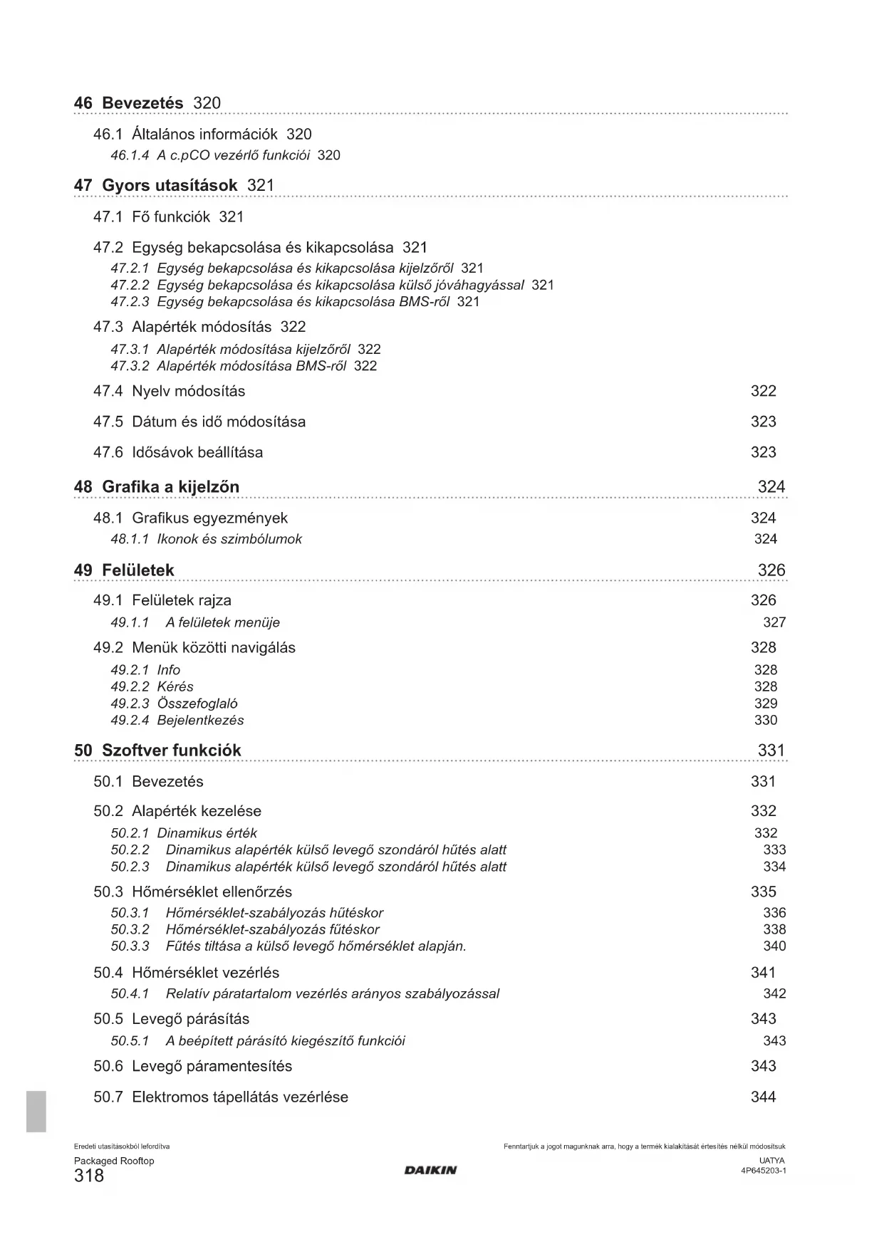 Az egységek kezeléséhez, a vezérlőbe egy megfelelő szoftver lett betöltve. A szoftver egy sor funkcióból áll, amelyek azokhoz a körülményekhez tartoznak, amelyben az egységek működnek. Az következő fejezetek ismertetik a szoftver által vezérelt funkciókat, amelyek az összes egységben megegyeznek, valamint a speciális verziókhoz és modellekhez tartozó funkciókat. Az itt ismertetett egyes funkciók csak speciális verzió és méret esetén állnak rendelkezésre, vagy a kiválasztott tartozékok alapján. A különféle funkciók leírásában az egységek működésében való hozzáértés és a megfelelő hidraulikus vagy hűtő áramkörök ismerete természetes. Valamennyi leírás, beállítás és paraméter a megfelelő dokumentációban előírt megfelelően telepített egységekre vonatkozik.Eredeti utasításokból lefordítvaPackaged Rooftop Fenntartjuk a jogot magunknak arra, hogy a termék kialakítását értesítés nélkül módosítsukUATYA4P645203-1