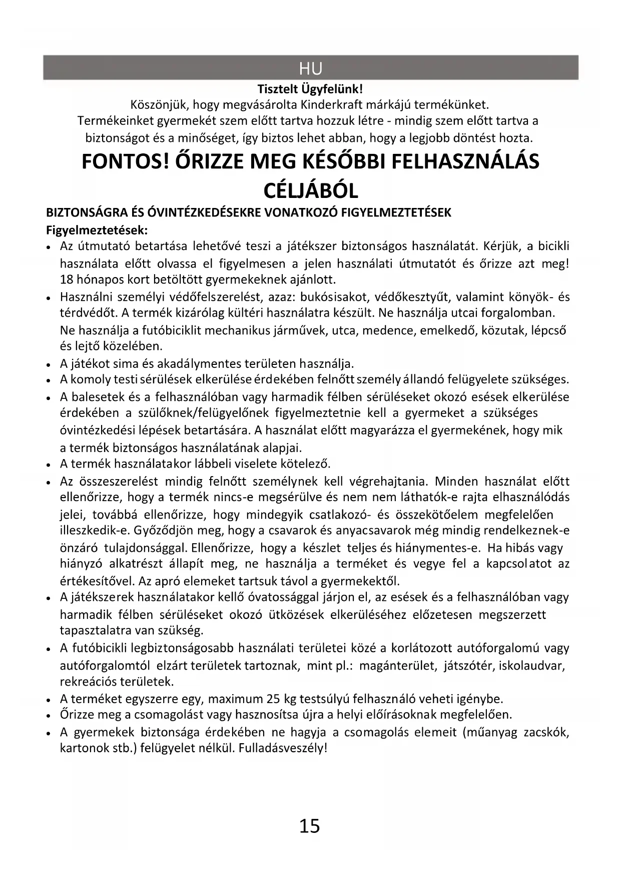 Tisztelt Ügyfelünk! Köszönjük, hogy megvásárolta Kinderkraft márkájú termékünket. Termékeinket gyermekét szem előtt tartva hozzuk létre - mindig szem előtt tartva a biztonságot és a minőséget, így biztos lehet abban, hogy a legjobb döntést hozta. FONTOS! ŐRIZZE MEG KÉSŐBBI FELHASZNÁLÁS