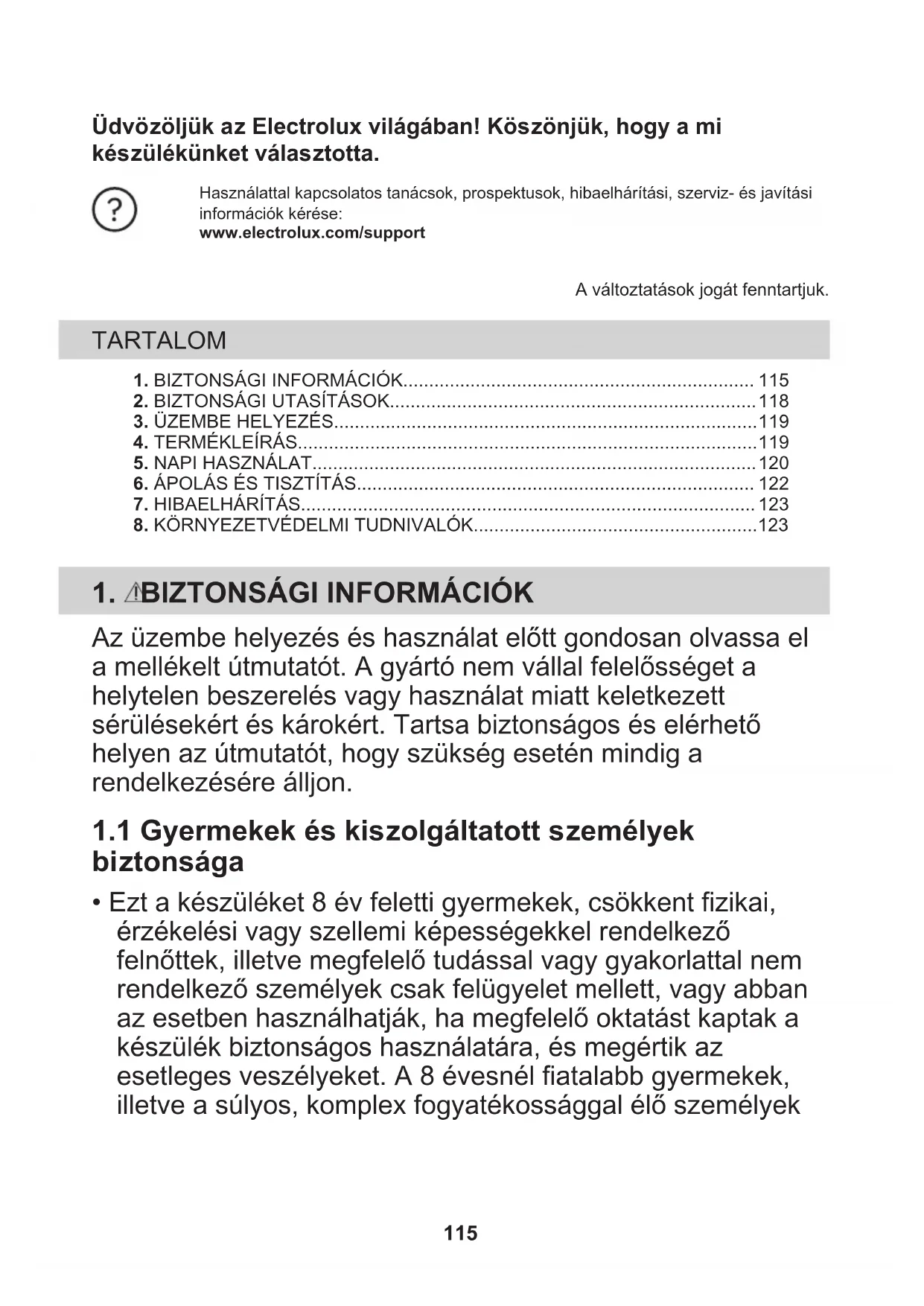 - Ezt a készüléket 8 év feletti gyermekek, csökkent fizikai, érzékelési vagy szellemi képességekkel rendelkező felnőttek, illetve megfelelő tudással vagy gyakorlattal nem rendelkező személyek csak felügyelet mellett, vagy abban az esetben használhatják, ha megfelelő oktatást kaptak a készülék biztonságos használatára, és megértik az esetleges veszélyeket. A 8 évesnél fiatalabb gyermekek, illetve a súlyos, komplex fogyatékossággal élő személyek 115állandó felügyelet nélkül nem tartózkodhatnak a készülék közelében.