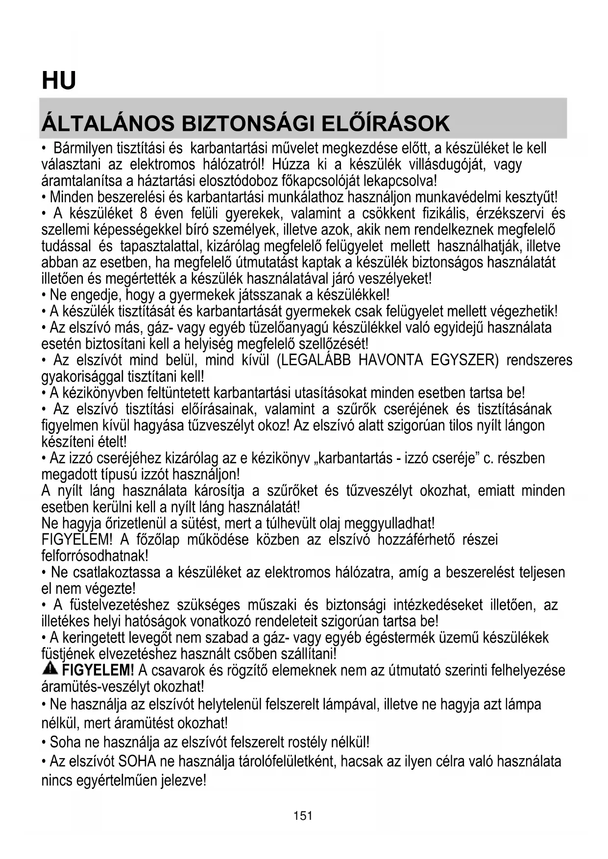 - Az izzó cseréjéhez kizárólag az e kézikönyv „karbantartás - izzó cseréje” c. részben megadott típusú izzót használjon! A nyílt láng használata károsítja a szűrőket és tűzveszélyt okozhat, emiatt minden esetben kerülni kell a nyílt láng használatát! Ne hagyja őrizetlenül a sütést, mert a túlhevült olaj meggyulladhat! FIGYELEM! A főzőlap működése közben az elszívó hozzáférhető részei felforrósodhatnak!