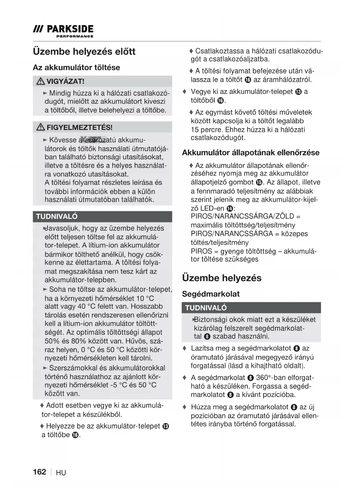 ֺHU %HYH]HWŤ Gratulálunk új készüléke megvásár- OûVûKR]9ûVûUOûVûYDONLYûOŒPLQŤ- VĝJƆWHUPĝNPHOOHWWGŚQWŚWW A használati útmutató a termék része. Fontos tudnivalókat tartalmaz a biztonságra, DKDV]QûODWUDĝVD]ûUWDOPDWODQķWûVUDYRQDW- NR]ŒDQ$WHUPĝNKDV]QûODWDHOŤWWLVPHU- kedjen meg valamennyi használati és biz- WRQVûJLXWDVķWûVVDO$WHUPĝNHWFVDND OHķUWDNV]HULQWĝVDPHJDGRWWFĝORNUDKDV]- nálja. A termék harmadik személynek törté- QŤWRYûEEDGûVDHVHWĝQDGMDûWDWHUPĝNKH] WDUWR]ŒYDODPHQQ\LOHķUûVWLV 5HQGHOWHWĝVV]HUƆKDV]QûODW A készülék az alábbi munkákhoz alkalmas: ▯ WĝJODEHWRQĝVNŤ]HWżWYHIŹUûVD ▯ EHWRQNŤ]HWĝVYDNRODWYĝVĝVH ▯ NŤ]HWIDĝVIĝPIŹUûVD A készülék minden más használata vagy PŒGRVķWûVDQHPUHQGHOWHWĝVV]HUƆQHNPL- QŤVżOĝVMHOHQWŤVEDOHVHWYHV]ĝO\WRNR]KDW $J\ûUWŒQHPYûOODOIHOHOŤVVĝJHWDQHPUHQ- GHOWHWĝVV]HUƆKDV]QûODWEŒOHUHGŤNûURNĝUW A készülék nem alkalmas ipari használatra. A készülék a Parkside sorozat része és a Parkside sorozat akku- PXOûWRUDLYDOż]HPHOWHWKHWŤ A Parkside sorozat akkumulátorait csak a Parkside VRUR]DWWŚOWŤLYHO szabad tölteni. Javasoljuk, hogy a készüléket kizárólag a NŚYHWNH]ŤDNNXPXOûWRURNNDOż]HPHOWHVVH 3$3ּּ$3$3ּּ$3$3ּּ$ 3$3ּּ%3$3ּּ%6PDUW3$36ּּ$ 6PDUW3$36ּּ$. Javasoljuk, hogy ezeket az akkumulátoro-