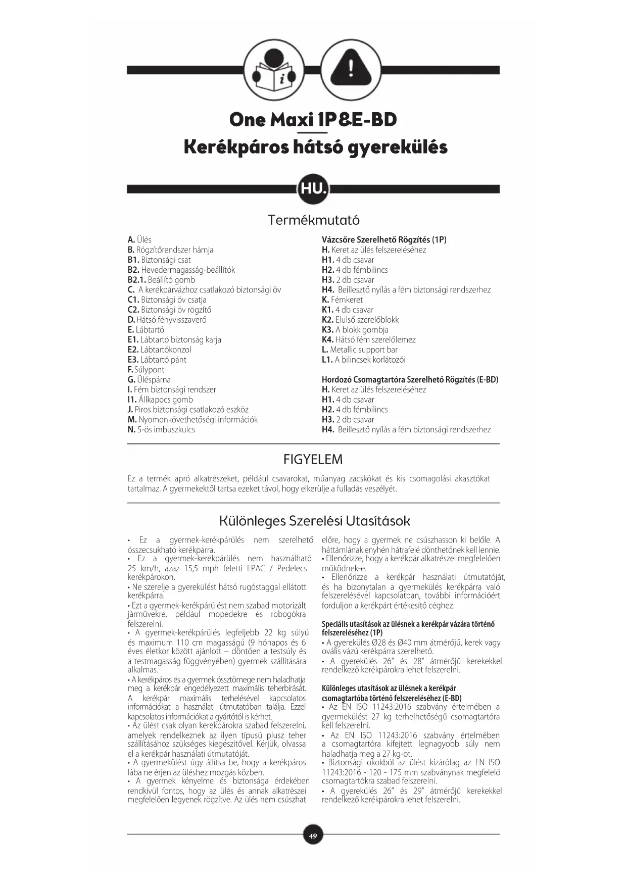 - A gyerekülés 26” és 29” átmérőjű kerekekkel rendelkező kerékpárokra lehet felszerelni. Termékmutató Különleges Szerelési Utasítások One Maxi 1P&E-BD Kerékpáros hátsó gyerekülés Ez a termék apró alkatrészeket, például csavarokat, műanyag zacskókat és kis csomagolási akasztókat tartalmaz. A gyermekektől tartsa ezeket távol, hogy elkerülje a fulladás veszélyét. FIGYELEM50