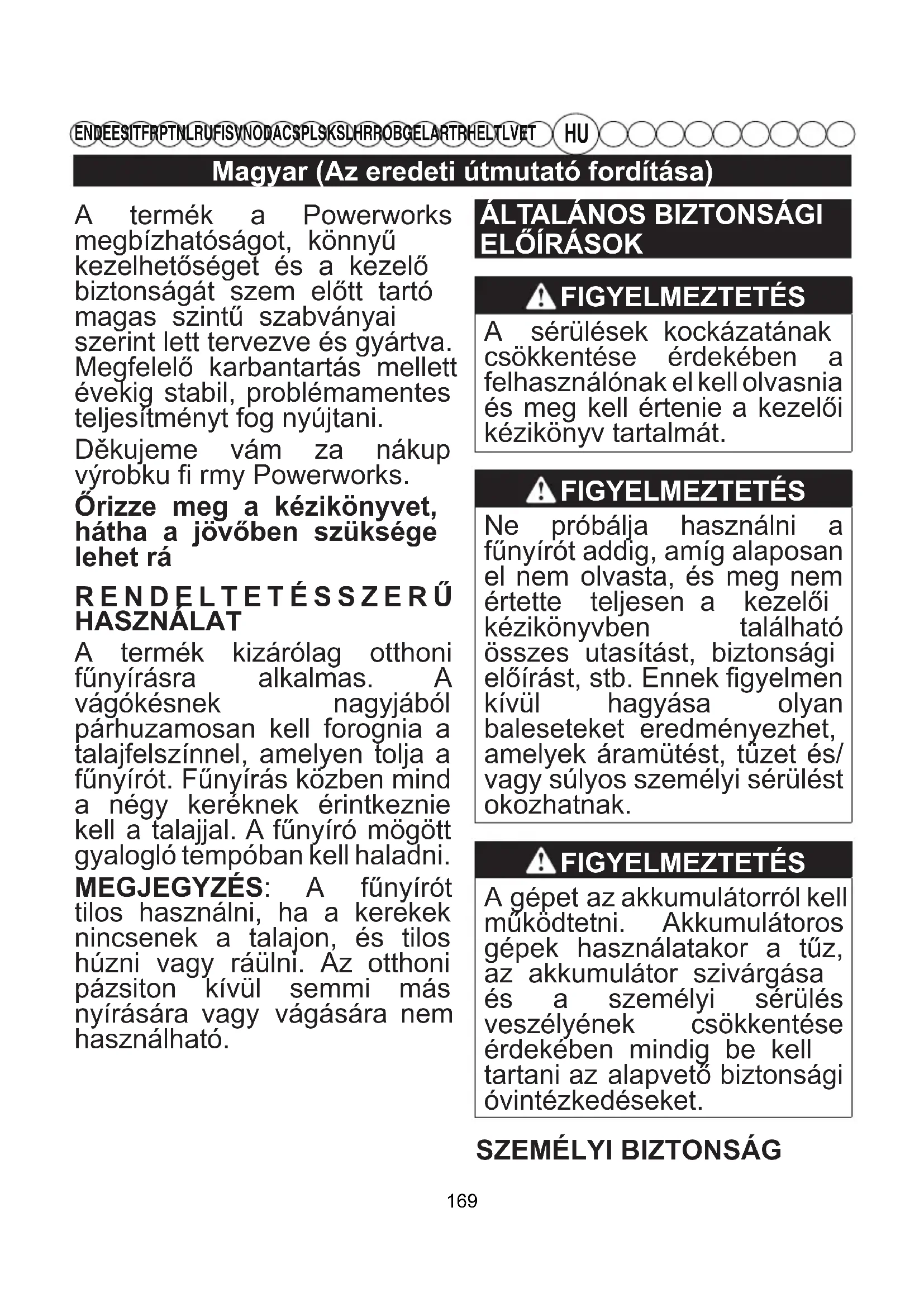 EN DE ES IT FR PT NL RU FI SV NO DA CS PL SK SL HR RO BG EL AR TR HE LT LV ET A termék a Powerworks megbízhatóságot, könnyű kezelhetőséget és a kezelő biztonságát szem előtt tartó magas szintű szabványai szerint lett tervezve és gyártva. Megfelelő karbantartás mellett évekig stabil, problémamentes teljesítményt fog nyújtani. Děkujeme vám za nákup výrobku fi rmy Powerworks. Őrizze meg a kézikönyvet, hátha a jövőben szüksége lehet rá RENDELTETÉSSZERŰ HASZNÁLAT A termék kizárólag otthoni fűnyírásra alkalmas. A vágókésnek nagyjából párhuzamosan kell forognia a talajfelszínnel, amelyen tolja a fűnyírót. Fűnyírás közben mind a négy keréknek érintkeznie kell a talajjal. A fűnyíró mögött gyalogló tempóban kell haladni. MEGJEGYZÉS: A fűnyírót tilos használni, ha a kerekek nincsenek a talajon, és tilos húzni vagy ráülni. Az otthoni pázsiton kívül semmi más nyírására vagy vágására nem használható.