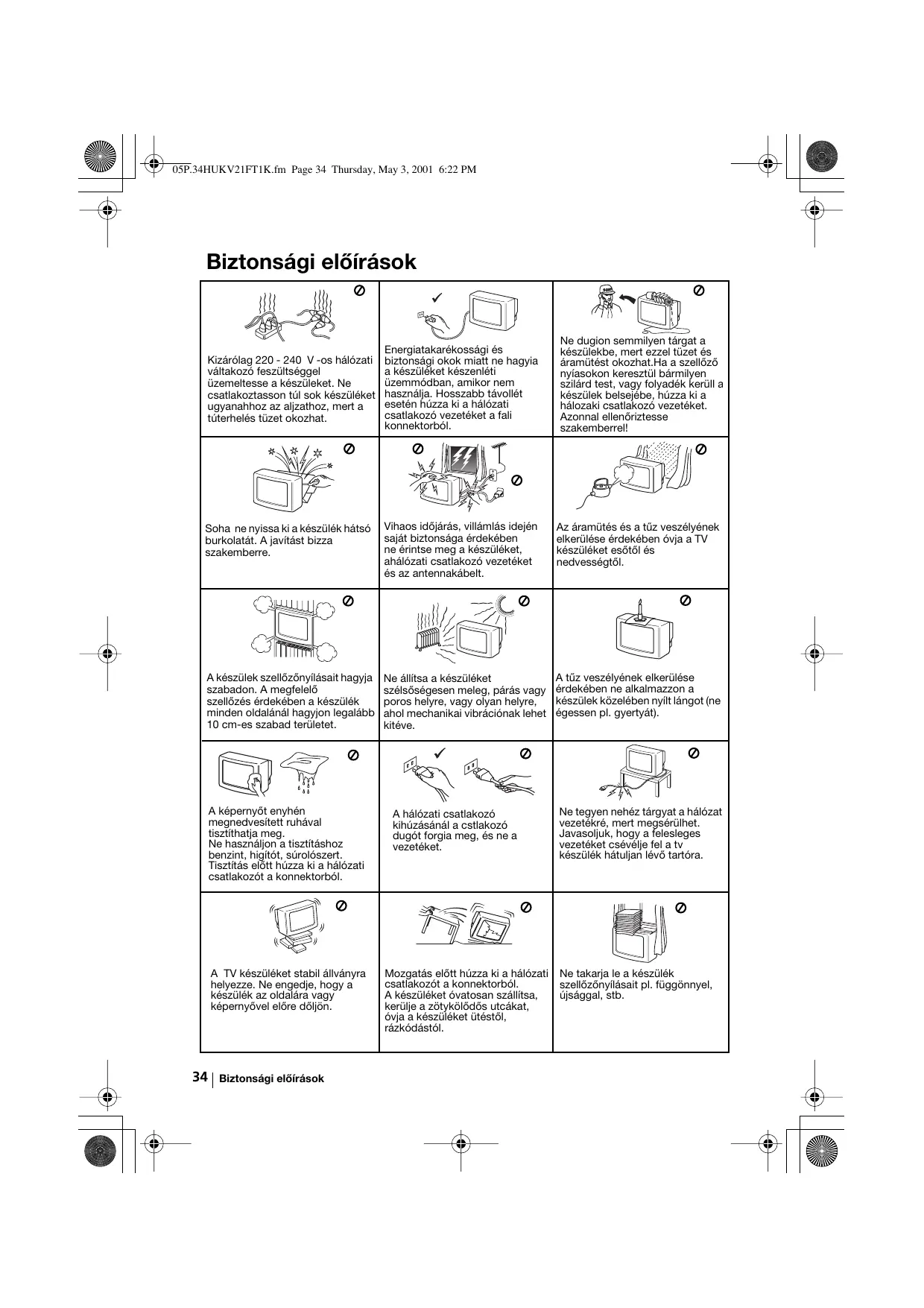 05P.34HUKV21FT1K.fm Page 34 Thursday, May 3, 2001 6:22 PM Biztonsági előírások Kizárólag 220 - 240 V -os hálózati váltakozó feszültséggel üzemeltesse a készüleket. Ne csatlakoztasson túl sok készüléket ugyanahhoz az aljzathoz, mert a túterhelés tüzet okozhat. Energiatakarékossági és biztonsági okok miatt ne hagyia a készüléket készenléti üzemmódban, amikor nem használja. Hosszabb távollét esetén húzza ki a hálózati csatlakozó vezetéket a fali konnektorból. Ne dugion semmilyen tárgat a készülekbe, mert ezzel tüzet és áramütést okozhat.Ha a szellőző nyíasokon keresztül bármilyen szilárd test, vagy folyadék kerüll a készülek belsejébe, húzza ki a hálozaki csatlakozó vezetéket. Azonnal ellenőriztesse szakemberrel! Soha ne nyissa ki a készülék hátsó burkolatát. A javítást bizza szakemberre. Vihaos időjárás, villámlás idején saját biztonsága érdekében ne érintse meg a készüléket, ahálózati csatlakozó vezetéket és az antennakábelt. Az áramütés és a tűz veszélyének elkerülése érdekében óvja a TV készüléket esőtől és nedvességtől. A készülek szellőzőnyílásait hagyja szabadon. A megfelelő szellőzés érdekében a készülék minden oldalánál hagyjon legalább 10 cm-es szabad területet. Ne állítsa a készüléket szélsőségesen meleg, párás vagy poros helyre, vagy olyan helyre, ahol mechanikai vibrációnak lehet kitéve. A tűz veszélyének elkerülése érdekében ne alkalmazzon a készülek közelében nyílt lángot (ne égessen pl. gyertyát). A képernyőt enyhén megnedvesített ruhával tisztíthatja meg. Ne használjon a tisztításhoz benzint, higítót, súrolószert. Tisztítás előtt húzza ki a hálózati csatlakozót a konnektorból. A TV készüléket stabil állványra helyezze. Ne engedje, hogy a készülék az oldalára vagy képernyővel előre dőljön.