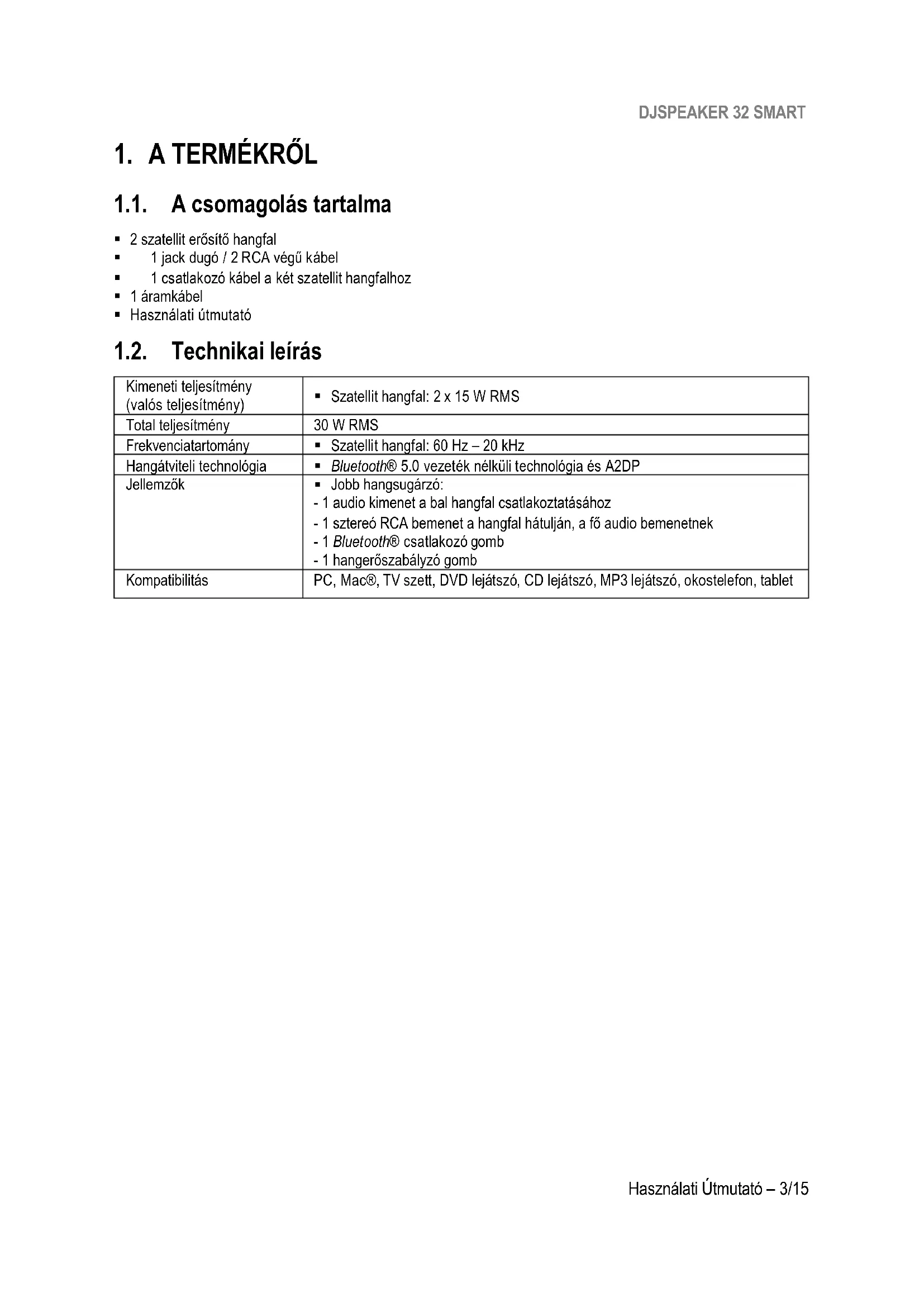 1.1. A csomagolás tartalma 2 szatellit erősítő hangfal 1 jack dugó / 2 RCA végű kábel 1 csatlakozó kábel a két szatellit hangfalhoz 1 áramkábel Használati útmutató 1.2. Technikai leírás Kimeneti teljesítmény (valós teljesítmény) Szatellit hangfal: 2 x 15 W RMS Total teljesítmény 30 W RMS Frekvenciatartomány Szatellit hangfal: 60 Hz – 20 kHz Hangátviteli technológia Bluetooth® 5.0 vezeték nélküli technológia és A2DP Jellemzők
