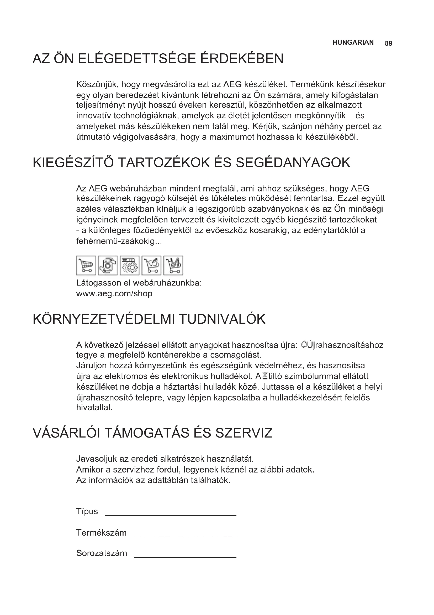 - Для заміни звертайтесь в технічну підтримку. («Для придбання звертайтесь в технічну під- тримку»).89 HUNGARIAN AZ ÖN ELÉGEDETTSÉGE ÉRDEKÉBEN Köszönjük, hogy megvásárolta ezt az AEG készüléket. Termékünk készítésekor egy olyan beredezést kívántunk létrehozni az Ön számára, amely kifogástalan teljesítményt nyújt hosszú éveken keresztül, köszönhetően az alkalmazott innovatív technológiáknak, amelyek az életét jelentősen megkönnyítik – és amelyeket más készülékeken nem talál meg. Kérjük, szánjon néhány percet az útmutató végigolvasására, hogy a maximumot hozhassa ki készülékéből. KIEGÉSZÍTŐ TARTOZÉKOK ÉS SEGÉDANYAGOK Az AEG webáruházban mindent megtalál, ami ahhoz szükséges, hogy AEG készülékeinek ragyogó külsejét és tökéletes működését fenntartsa. Ezzel együtt széles választékban kínáljuk a legszigorúbb szabványoknak és az Ön minőségi igényeinek megfelelően tervezett és kivitelezett egyéb kiegészítő tartozékokat - a különleges főzőedényektől az evőeszköz kosarakig, az edénytartóktól a fehérnemű-zsákokig... Látogasson el webáruházunkba: www.aeg.com/shop