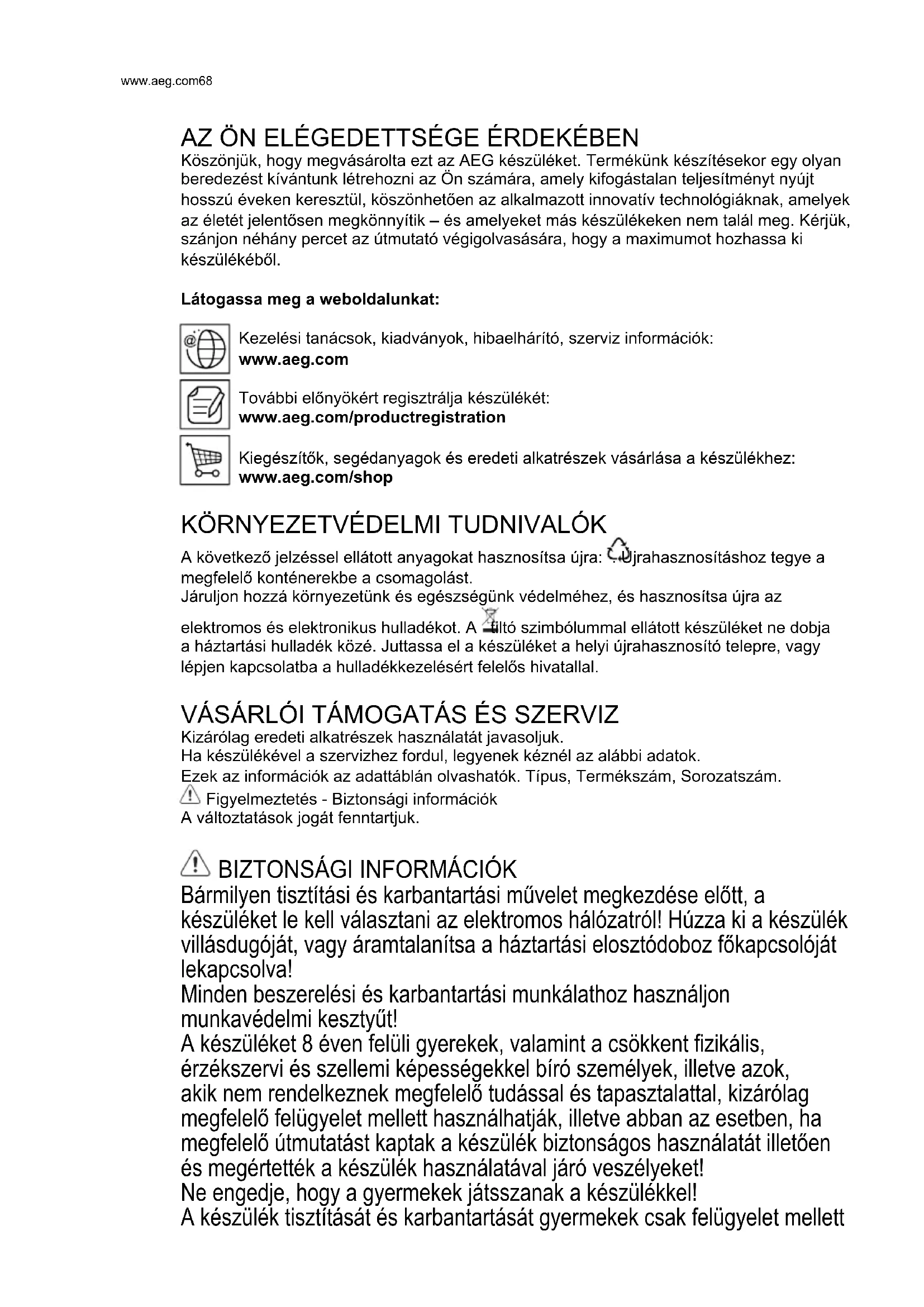 A következő jelzéssel ellátott anyagokat hasznosítsa újra: . Újrahasznosításhoz tegye a megfelelő konténerekbe a csomagolást. Járuljon hozzá környezetünk és egészségünk védelméhez, és hasznosítsa újra az elektromos és elektronikus hulladékot. A tiltó szimbólummal ellátott készüléket ne dobja a háztartási hulladék közé. Juttassa el a készüléket a helyi újrahasznosító telepre, vagy lépjen kapcsolatba a hulladékkezelésért felelős hivatallal. VÁSÁRLÓI TÁMOGATÁS ÉS SZERVIZ Kizárólag eredeti alkatrészek használatát javasoljuk. Ha készülékével a szervizhez fordul, legyenek kéznél az alábbi adatok. Ezek az információk az adattáblán olvashatók. Típus, Termékszám, Sorozatszám. Figyelmeztetés - Biztonsági információk A változtatások jogát fenntartjuk.