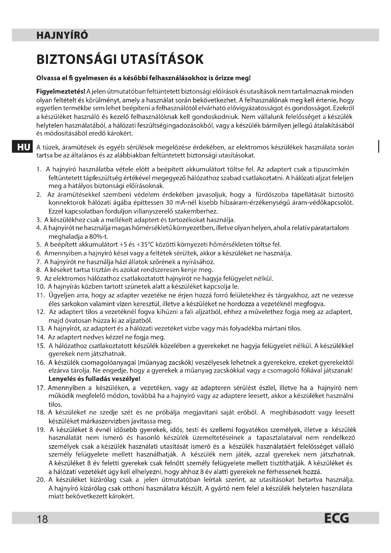 17. Amennyiben a készüléken, a vezetéken, vagy az adapteren sérülést észlel, illetve ha a hajnyíró nem