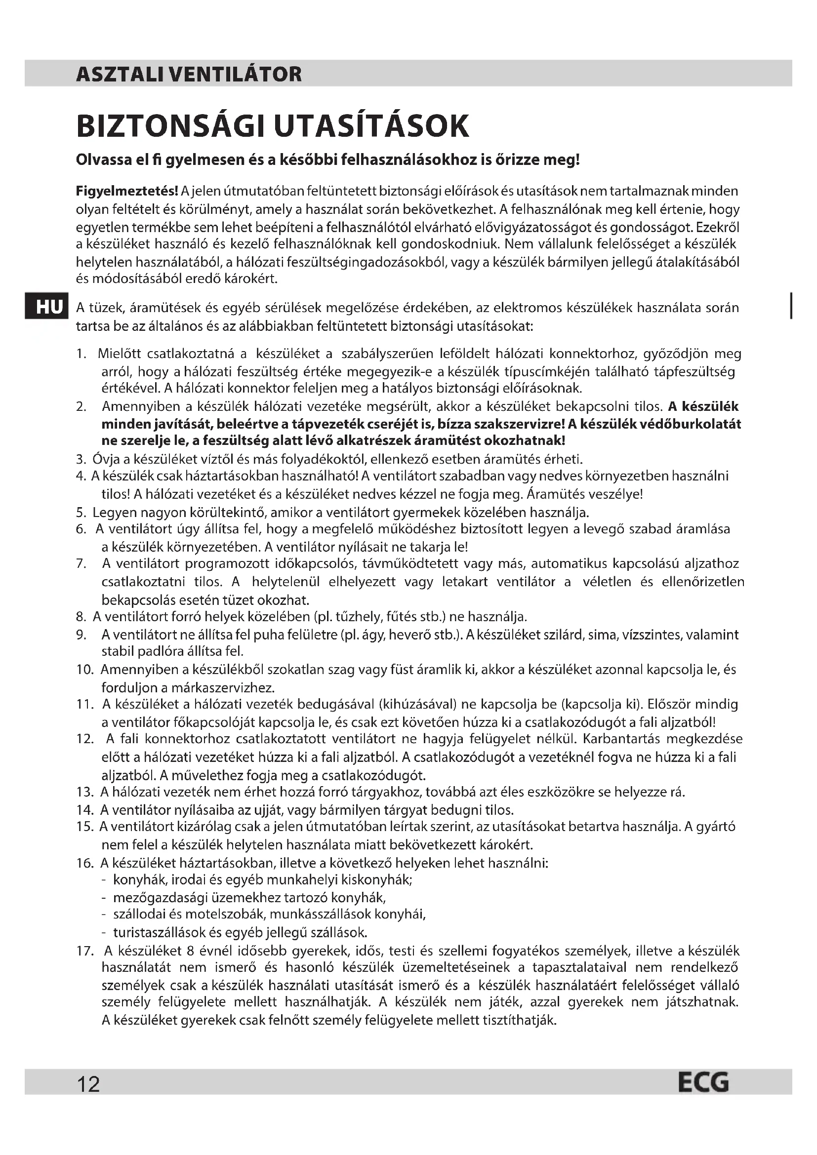 Átmérő: 30 cm Névleges feszültség: 220–240 V~ 50 Hz Névleges teljesítményfelvétel: 45 W Zajszint: 51 dB GARANCIA: akövetkező használati mód agarancia megszűnését jelenti. A készüléket szakszerűtlenül és nem a használati útmutató szerint, illetve a rendeltetésétől eltérő célokra használták. Akészüléket nagy erővel nyomták. Akészüléket nem amárkaszerviz javította meg. Akészüléket átalakították. A használatból eredő kopásoknak kitett alkatrészekre agarancia nem vonatkozik. HULLADÉKFELHASZNÁLÁS ÉS MEGSEMMISÍTÉS A csomagolópapírt és hullámpapírt adja le hulladékgyűjtő telepen. Csomagolófólia, PE zacskók, műanyag alkatrészek – műanyaggyűjtő szelektív hulladéktároló edénybe. ÉLETTARTAM LEJÁRTÁT KÖVETŐ MEGSEMMISÍTÉS Használt elektromos és elektronikus készülékek megsemmisítése (érvényes az EU tagállamokban és számos szelektív hulladékgyűjtést végző európai országban) Ez a terméken vagy csomagolásán található jelzés azt mutatja, hogy a terméket tilos standard háztartási hulladékként megsemmisíteni. A terméket elektromos és elektronikus berendezések újrahasznosítására szakosodott hulladékgyűjtő telepen adja le. A termék helyes megsemmisítésével megelőzi, hogy káros hatást fejtsen ki az emberi egészségre és környezetünkre. Az anyagok újrahasznosítása kíméli a természetes forrásainkat. A termék újrahasznosításával kapcsolatosan bővebb információkat a helyi önkormányzattól, aháztartási hulladékot feldolgozó szervezettől, vagy a termék forgalmazójától kérhet. Ez a termék megfelel a kisfeszültségű berendezések biztonságára és az elektromágneses kompatibilitásra vonatkozó EU irányelveknek. A készülék használati útmutatója a www.ecg-electro.eu oldalon található. A szöveg és a műszaki paraméterek megváltoztatásának a joga fenntartva. 08/05DE TISCHVENTILATOR