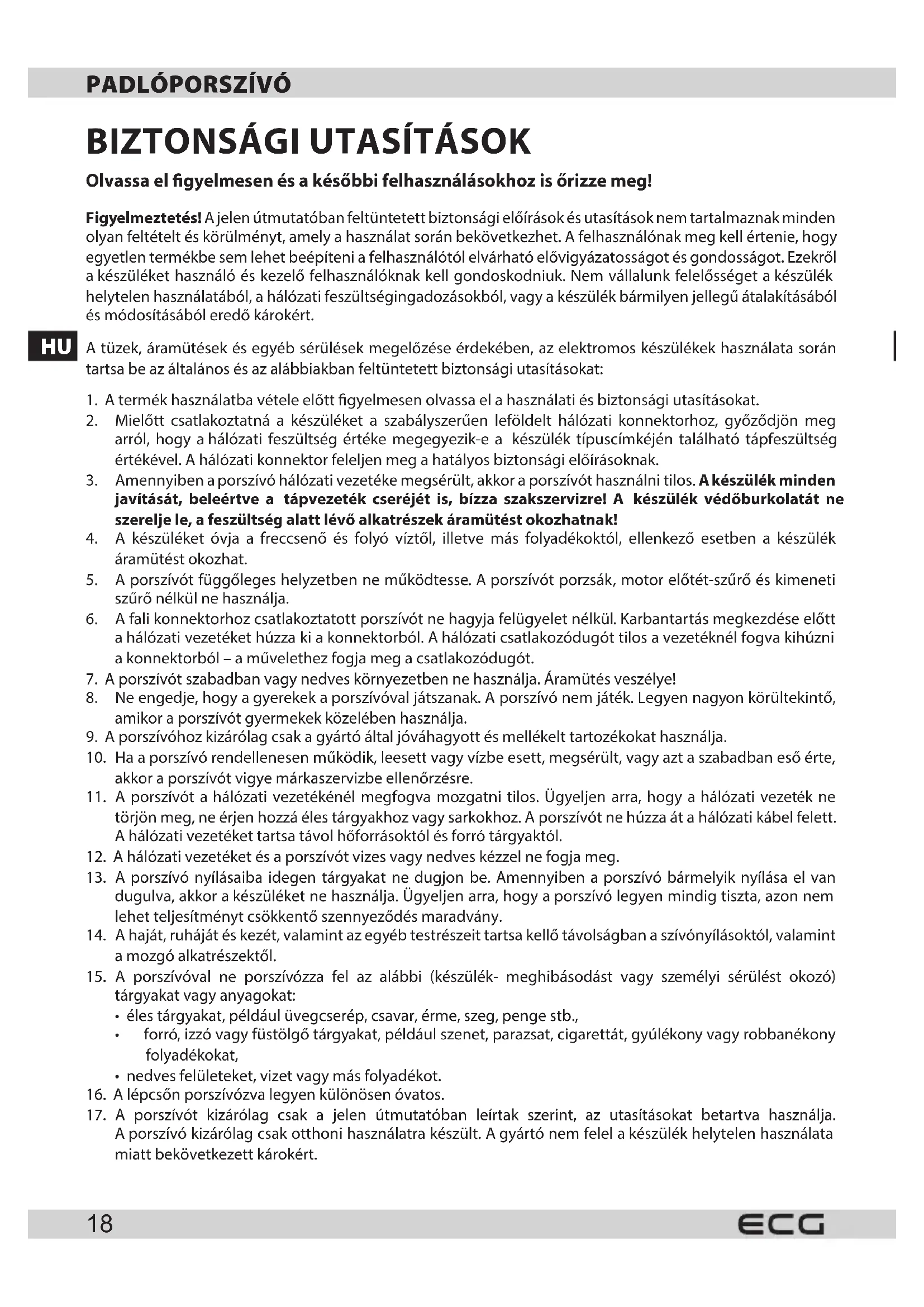 17. A porszívót kizárólag csak a jelen útmutatóban leírtak szerint, az utasításokat betartva használja.