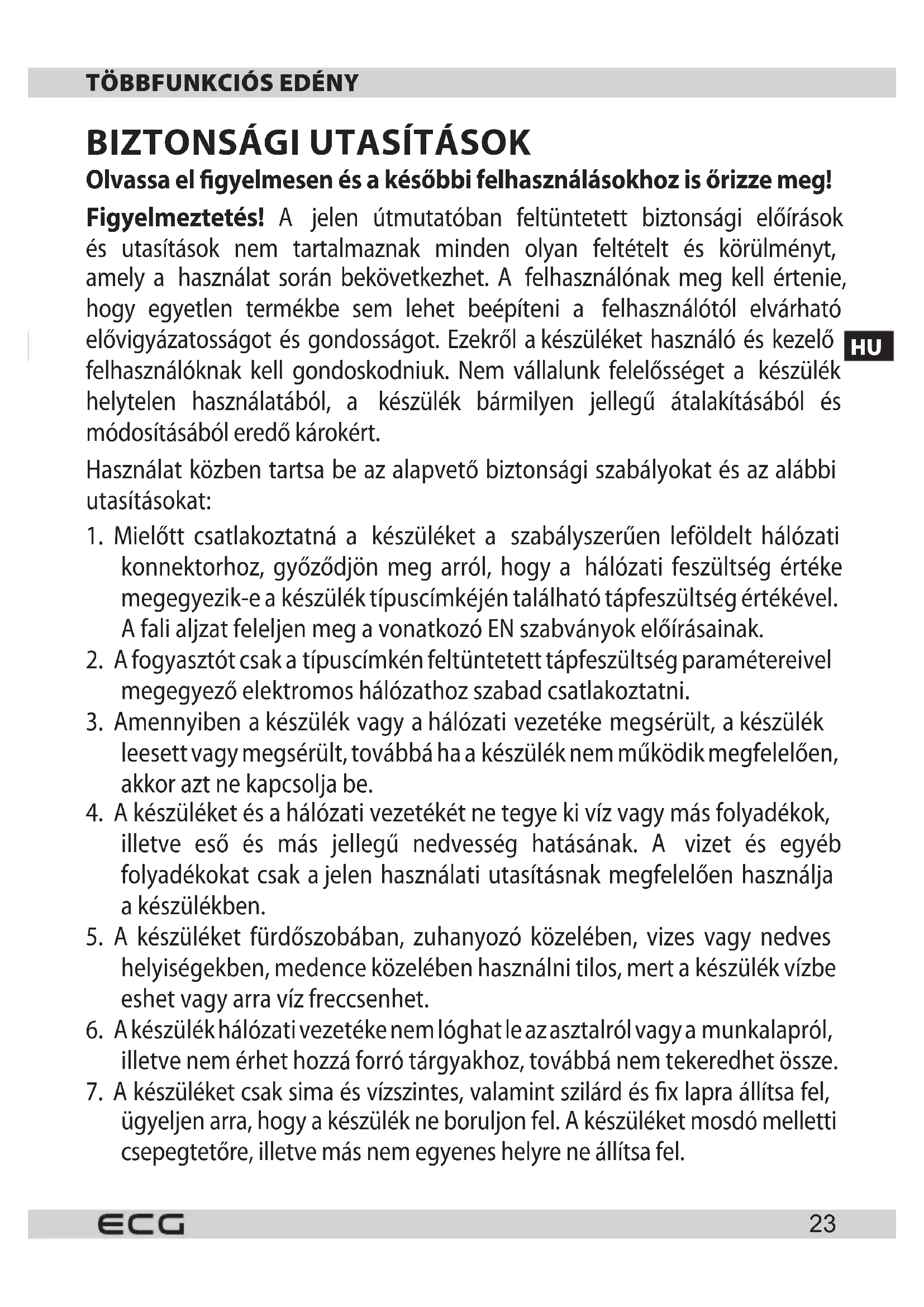 Edény térfogata 5 l Maximális olajtöltet: 2,9 l Névleges feszültség: 220–240 V~ 50–60 Hz Névleges teljesítményfelvétel: 1500 W HULLADÉKFELHASZNÁLÁS ÉS MEGSEMMISÍTÉS A csomagolópapírt és hullámpapírt adja le hulladékgyűjtő telepen. Csomagolófólia, PE zacskók, műanyag alkatrészek – műanyaggyűjtő szelektív hulladéktároló edénybe. ÉLETTARTAM LEJÁRTÁT KÖVETŐ MEGSEMMISÍTÉS Használt elektromos és elektronikus készülékek megsemmisítése (érvényes az EU tagállamokban és számos szelektív hulladékgyűjtést végző európai országban)Ez aterméken vagy csomagolásán található jelzés azt mutatja, hogy aterméket tilos standard háztartási hulladékként megsemmisíteni. Aterméket elektromos és elektronikus berendezések újrahasznosítására szakosodott hulladékgyűjtő telepen adja le. A termék helyes megsemmisítésével megelőzi, hogy káros hatást fejtsen ki az emberi egészségre és környezetünkre. Az anyagok újrahasznosítása kíméli a természetes forrásainkat. A termék újrahasznosításával kapcsolatosan bővebb információkat a helyi önkormányzattól, a háztartási hulladékot feldolgozó szervezettől, vagy atermék forgalmazójától kérhet. Ez atermék megfelel akisfeszültségű berendezések biztonságára és az elektromágneses kompatibilitásra vonatkozó EU irányelveknek. A készülék használati útmutatója awww.ecg-electro.eu oldalon található. A szöveg és aműszaki paraméterek megváltoztatásának ajoga fenntartva. 08/05DE MULTIFUNKTIONSKOCHTOPF