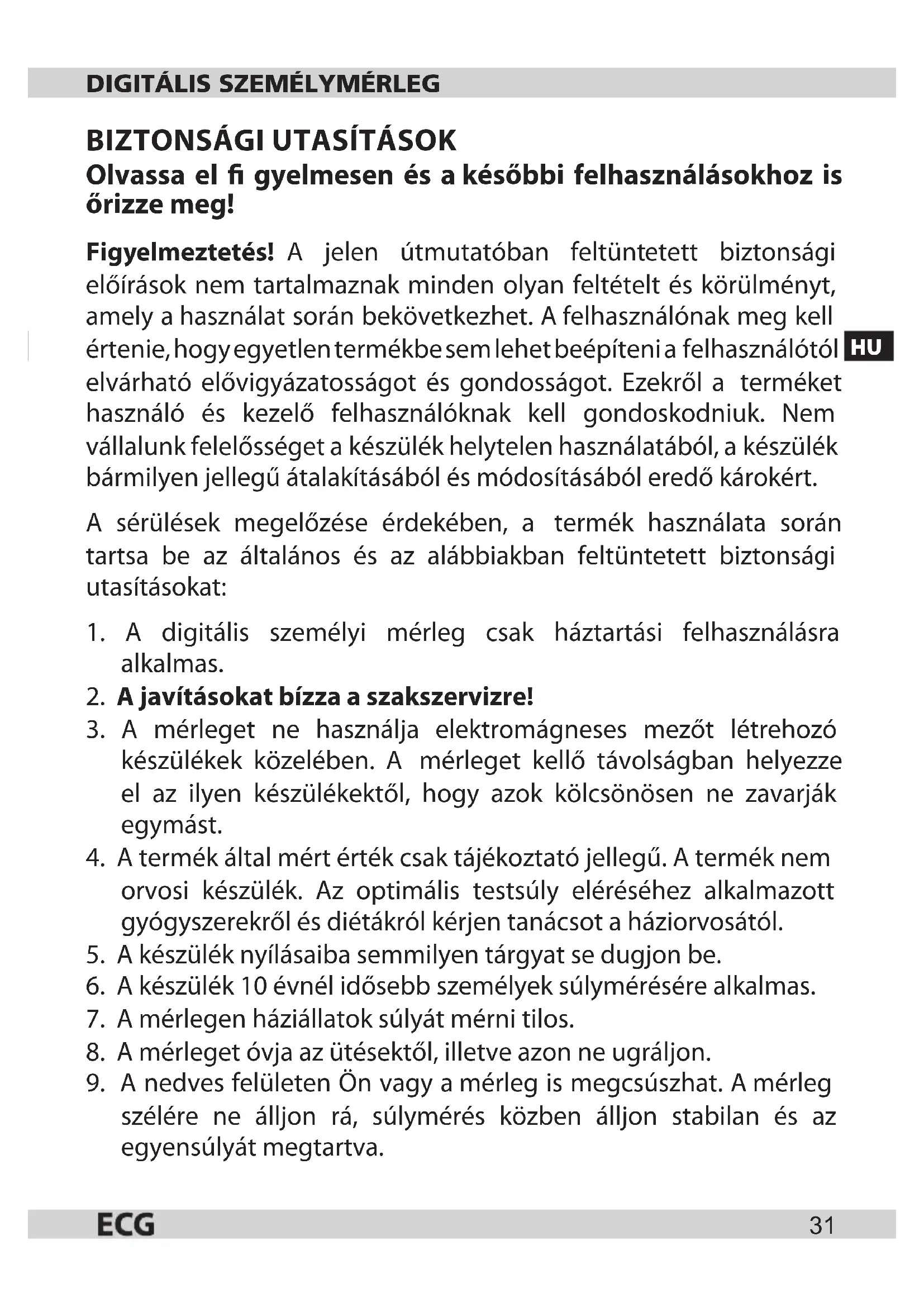 Maximális terhelhetőség: 180 kg Méréslépték: 100 g/ 0,1% Tápellátás: 2 × 1,5 VAAA ceruzaelem (nem tartozék) HULLADÉKFELHASZNÁLÁS ÉS MEGSEMMISÍTÉS A csomagolópapírt és hullámpapírt adja le hulladékgyűjtő telepen. Csomagolófólia, PE zacskók, műanyag alkatrészek – műanyaggyűjtő szelektív hulladéktároló edénybe. ÉLETTARTAM LEJÁRTÁT KÖVETŐ MEGSEMMISÍTÉS Használt elektromos és elektronikus készülékek megsemmisítése (érvényes az EU tagállamokban és számos szelektív hulladékgyűjtést végző európai országban) Ez a terméken vagy csomagolásán található jelzés azt mutatja, hogy a terméket tilos standard háztartási hulladékként megsemmisíteni. A terméket elektromos és elektronikus berendezések újrahasznosítására szakosodott hulladékgyűjtő telepen adja le. A termék helyes megsemmisítésével megelőzi, hogy káros hatást fejtsen ki az emberi egészségre és környezetünkre. Az anyagok újrahasznosítása kíméli a természetes forrásainkat. A termék újrahasznosításával kapcsolatosan bővebb információkat a helyi önkormányzattól, aháztartási hulladékot feldolgozó szervezettől, vagy a termék forgalmazójától kérhet. Ez a termék megfelel a kisfeszültségű berendezések biztonságára és az elektromágneses kompatibilitásra vonatkozó EU irányelveknek. A készülék használati útmutatója a www.ecg.cz oldalon található. A szöveg és a műszaki paraméterek megváltoztatásának a joga fenntartva. 08/05DE DIGITALE PERSONENWAAGE
