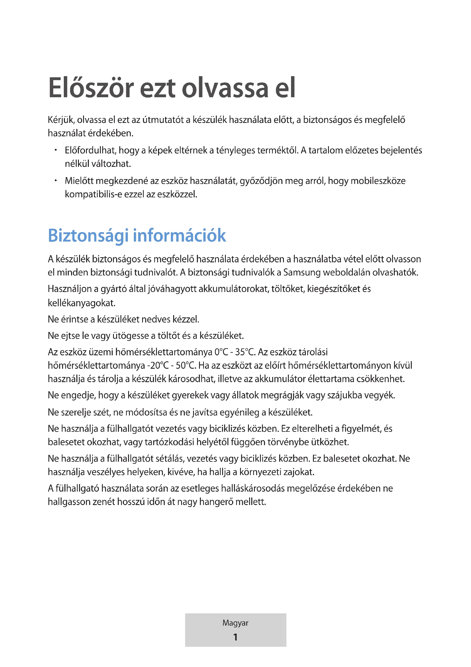 Mielőtt megkezdené az eszköz használatát, győződjön meg arról, hogy mobileszköze kompatibilis-e ezzel az eszközzel. Biztonsági információk A készülék biztonságos és megfelelő használata érdekében a használatba vétel előtt olvasson el minden biztonsági tudnivalót. A biztonsági tudnivalók a Samsung weboldalán olvashatók. Használjon a gyártó által jóváhagyott akkumulátorokat, töltőket, kiegészítőket és kellékanyagokat. Ne érintse a készüléket nedves kézzel. Ne ejtse le vagy ütögesse a töltőt és a készüléket. Az eszköz üzemi hőmérséklettartománya 0°C - 35°C. Az eszköz tárolási hőmérséklettartománya -20°C - 50°C. Ha az eszközt az előírt hőmérséklettartományon kívül használja és tárolja a készülék károsodhat, illetve az akkumulátor élettartama csökkenhet. Ne engedje, hogy a készüléket gyerekek vagy állatok megrágják vagy szájukba vegyék. Ne szerelje szét, ne módosítsa és ne javítsa egyénileg a készüléket. Ne használja a fülhallgatót vezetés vagy biciklizés közben. Ez elterelheti a figyelmét, és balesetet okozhat, vagy tartózkodási helyétől függően törvénybe ütközhet. Ne használja a fülhallgatót sétálás, vezetés vagy biciklizés közben. Ez balesetet okozhat. Ne használja veszélyes helyeken, kivéve, ha hallja a környezeti zajokat. A fülhallgató használata során az esetleges halláskárosodás megelőzése érdekében ne hallgasson zenét hosszú időn át nagy hangerő mellett.2