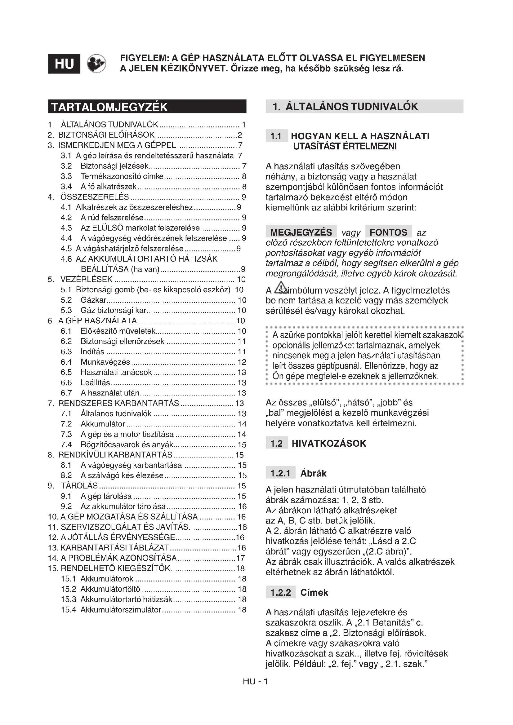 A használati utasítás fejezetekre és szakaszokra oszlik. A „2.1 Betanítás” c. szakasz címe a „2. Biztonsági előírások. A címekre vagy szakaszokra való hivatkozásokat a szak.., illetve fej. rövidítések jelölik. Például: „2. fej.” vagy „ 2.1. szak.” TARTALOMJEGYZÉK