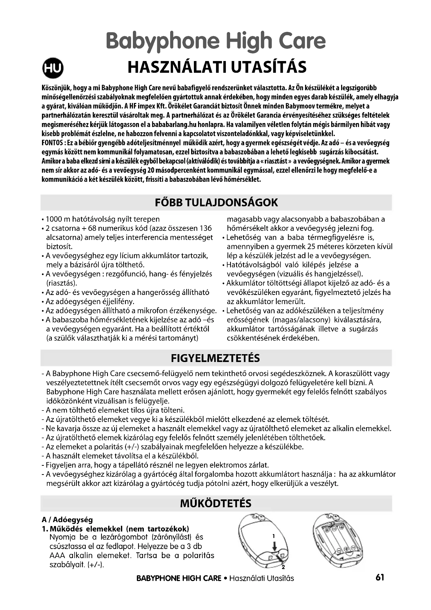 FIGYELMEZTETÉS - A Babyphone High Care csecsemő-felügyelő nem tekinthető orvosi segédeszköznek. A koraszülött vagyveszélyeztetettnek ítélt csecsemőt orvos vagy egy egészségügyi dolgozó felügyeletére kell bízni. ABabyphone High Care használata mellett erősen ajánlott, hogy gyermekét egy felelős felnőtt szabályosidőközönként vizuálisan is felügyelje.- A nem tölthető elemeket tilos újra tölteni.- Az újratölthető elemeket vegye ki a készülékből mielőtt elkezdené az elemek töltését.- Ne kavarja össze az új elemeket a használt elemekkel vagy az újratölthető elemeket az alkalin elemekkel. - Az újratölthető elemek kizárólag egy felelős felnőtt személy jelenlétében tölthetőek.- Az elemeket a polaritás (+/-) szabályainak megfelelően helyezze a készülékbe.- A használt elemeket távolítsa el a készülékből.- Figyeljen arra, hogy a tápellátó résznél ne legyen elektromos zárlat.- A vevőegységhez kizárólag a gyártócég által forgalomba hozott akkumlátort használja : ha az akkumlátormegsérült akkor azt kizárólag a gyártócég tudja pótolni azért, hogy elkerüljük a veszélyt.