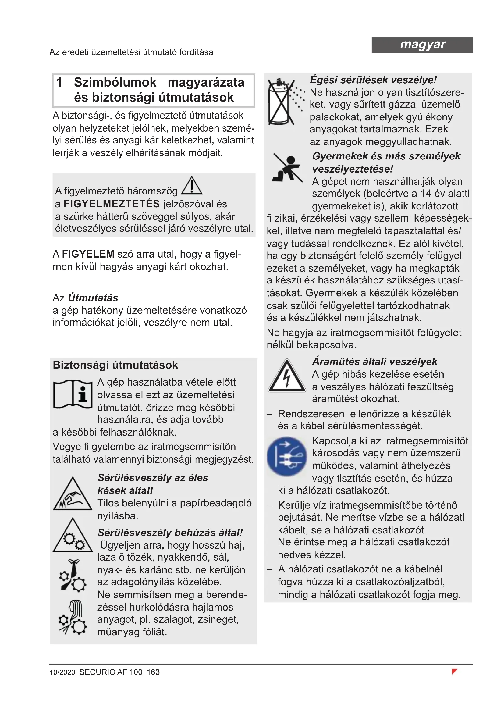 - Maks. broj listova (DIN A4, 70 g/m² odnosno 80 g/m²), dovedenih uzdužno, koji se režu u jednom prolazu. Izračun navedenih podataka o učinku vrši se na novom, nauljenom reznom mehanizmu i hladnom motoru te se odnosi na napon od 230 V / 50 Hz odnosno 120 V / 60 Hz. Slabiji mrežni napon ili druga frekvencija mreže od navedenih mogu uzrokovati smanjeni učinak i povećane zvukove pri radu. Učinak može odstupati ovisno o strukturi i svojstvima papira te vrsti umetanja.10/2020 SECURIO AF 100 163 magyar Az eredeti üzemeltetési útmutató fordítása 1 Szimbólumok magyarázata és biztonsági útmutatások A biztonsági-, és fi gyelmeztető útmutatások olyan helyzeteket jelölnek, melyekben szemé- lyi sérülés és anyagi kár keletkezhet, valamint leírják a veszély elhárításának módjait. Az Útmutatás a gép hatékony üzemeltetésére vonatkozó információkat jelöli, veszélyre nem utal. A fi gyelmeztető háromszög a FIGYELMEZTETÉS jelzőszóval és a szürke hátterű szöveggel súlyos, akár életveszélyes sérüléssel járó veszélyre utal. A FIGYELEM szó arra utal, hogy a fi gyel- men kívül hagyás anyagi kárt okozhat. Biztonsági útmutatások A gép használatba vétele előtt olvassa el ezt az üzemeltetési útmutatót, őrizze meg későbbi használatra, és adja tovább a későbbi felhasználóknak. Vegye fi gyelembe az iratmegsemmisítőn található valamennyi biztonsági megjegyzést. Sérülésveszély az éles kések által! Tilos belenyúlni a papírbeadagoló nyílásba. Sérülésveszély behúzás által! Ügyeljen arra, hogy hosszú haj, laza öltözék, nyakkendő, sál, nyak- és karlánc stb. ne kerüljön az adagolónyílás közelébe. Ne semmisítsen meg a berende- zéssel hurkolódásra hajlamos anyagot, pl. szalagot, zsineget, műanyag fóliát. Égési sérülések veszélye! Ne használjon olyan tisztítószere- ket, vagy sűrített gázzal üzemelő palackokat, amelyek gyúlékony anyagokat tartalmaznak. Ezek az anyagok meggyulladhatnak. Gyermekek és más személyek veszélyeztetése! A gépet nem használhatják olyan személyek (beleértve a 14 év alatti gyermekeket is), akik korlátozott fi zikai, érzékelési vagy szellemi képességek- kel, illetve nem megfelelő tapasztalattal és/ vagy tudással rendelkeznek. Ez alól kivétel, ha egy biztonságért felelő személy felügyeli ezeket a személyeket, vagy ha megkapták a készülék használatához szükséges utasí- tásokat. Gyermekek a készülék közelében csak szülői felügyelettel tartózkodhatnak és a készülékkel nem játszhatnak. Ne hagyja az iratmegsemmisítőt felügyelet nélkül bekapcsolva. Áramütés általi veszélyek A gép hibás kezelése esetén a veszélyes hálózati feszültség áramütést okozhat. – Rendszeresen ellenőrizze a készülék és a kábel sérülésmentességét. Kapcsolja ki az iratmegsemmisítőt károsodás vagy nem üzemszerű működés, valamint áthelyezés vagy tisztítás esetén, és húzza ki a hálózati csatlakozót. – Kerülje víz iratmegsemmisítőbe történő bejutását. Ne merítse vízbe se a hálózati kábelt, se a hálózati csatlakozót. Ne érintse meg a hálózati csatlakozót nedves kézzel. – A hálózati csatlakozót ne a kábelnél fogva húzza ki a csatlakozóaljzatból, mindig a hálózati csatlakozót fogja meg.164 SECURIO AF 100 10/2020 magyar 3 Áttekintés