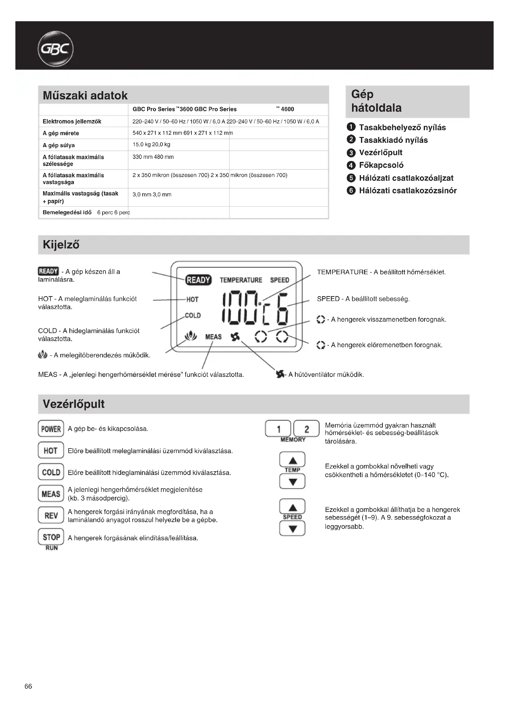 - A laminálás előtt ne vágja méretre a tasakokat. Laminálási útmutató Papírtípus Fóliavastagság Beállításhordozókartonhasználatanélkül Beállításhordozókartonhasználataesetén Hőmérséklet Sebesség Hőmérséklet Sebesség Normálpapír 75–100 mikron 100 °C 6 130 °C 4 125–150 mikron 120 °C 4 130 °C 3 175–250 mikron 120 °C 3 140 °C 2 300–350 mikron 130 °C 2 – - Brosúrapapír 75–100 mikron 100 °C 5 130 °C 4 125–150 mikron 120 °C 3 140 °C 3 175–250 mikron 130 °C 2 140 °C 2 300–350 mikron 140 °C 2 – - Fotópapír 75–100 mikron 100 °C 4 130 °C 3 125–150 mikron 130 °C 3 140 °C 2 175–250 mikron 140 °C 2 140 °C 1 MEGJEGYZÉS: Készenléti üzemmódhoz állítsa a hőmérsékletet 70 °C és a sebességet 2 értékre. Garancia A vásárlás dátumát követő 1 éven keresztül jótállást vállalunk a gép működéséért normál használat esetén. A jótállási időszak alatt az ACCO Brands Europe – saját belátása szerint – díjmentesen megjavítja vagy kicseréli a meghibásodott gépet. A jótállás nem vonatkozik a helytelen vagy nem rendeltetésszerű használat miatt fellépő hibákra. A jótállás igénybevételéhez be kell mutatni a vásárlás dátumát igazoló dokumentumot. Az ACCO Brands Europe által nem feljogosított személy által végzett javítás vagy átalakítás érvényteleníti a garanciát. Mindent megteszünk annak érdekében, hogy termékeink a műszaki adatoknál leírtaknak megfelelő teljesítményt nyújtsák. A jelen jótállás nem befolyásolja azokat a törvényes jogokat, amelyekkel ügyfeleink az áruértékesítésre vonatkozó nemzeti jogszabályok szerint rendelkeznek. Ha a garanciális időszak alatt műszaki hibát észlel, forduljon az illetékes ACCO vevőszolgálati központhoz. A meghibásodás jellegétől és a modelltől függően egyeztetünk, hogy vagy egy szakemberünk kimegy a helyszínre, vagy megkérjük, hogy a gépet juttassa vissza az ACCO céghez. A gép visszajuttatása esetén az ACCO cég saját belátása szerint és a törvényekkel összhangban vagy (i) új vagy felújított alkatrészek felhasználásával megjavítja a gépet, vagy (ii) kicseréli a gépet az eredetivel egyenértékű új vagy felújított gépre. A termék az interneten a következő címen regisztrálható: www.accobrands.com70 Техническиехарактеристики GBC Pro Series