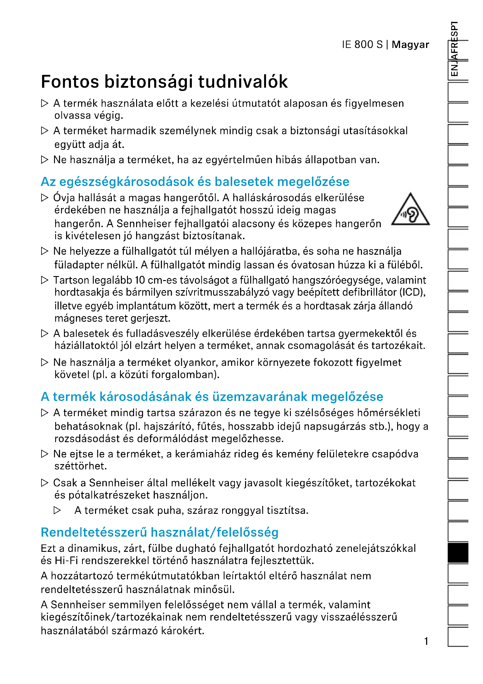- Smernica o odpade z elektrických a elektronických zariadení (OEEZ) (2012/19/EÚ) Symbol preškrtnutej nádoby na odpad na kolieskach na výrobku, batérii/akumulátore (ak je to relevantné) a/alebo obale vás upozorňuje na to, že sa tieto výrobky nesmú likvidovať v bežnom domovom odpade po skončení ich životnosti, ale musia sa odovzdať na osobitnú likvidáciu. Pri obaloch dodržiavajte zákonné predpisy na triedenie odpadu vo vašej krajine. Ďalšie informácie týkajúce sa recyklácie týchto výrobkov získate na správnom úrade vašej obce, komunálnych zberných alebo odberných miestach alebo u partnerov spoločnosti Sennheiser. Osobitný zber odpadu z elektrických a elektronických zariadení, batérií/ akumulátorov (ak je to relevantné) a obalov slúži na podporu recyklácie a/alebo zhodnotenia a na zamedzenie negatívnych vplyvov, napríklad v dôsledku potenciálne obsiahnutých škodlivých látok. Tým významne prispejete k ochrane životného prostredia a zdravia.1 IE 800 S | Magyar ENJAFRESPTNLITDASVFIELPLTRRUZHTWKOIDEELVLTCSSKHUROBGSLHR DE Fontos biztonsági tudnivalók ▷ A termék használata előtt a kezelési útmutatót alaposan és figyelmesen olvassa végig. ▷ A terméket harmadik személynek mindig csak a biztonsági utasításokkal együtt adja át. ▷ Ne használja a terméket, ha az egyértelműen hibás állapotban van. Az egészségkárosodások és balesetek megelőzése ▷ Óvja hallását a magas hangerőtől. A halláskárosodás elkerülése érdekében ne használja a fejhallgatót hosszú ideig magas hangerőn. A Sennheiser fejhallgatói alacsony és közepes hangerőn is kivételesen jó hangzást biztosítanak. ▷ Ne helyezze a fülhallgatót túl mélyen a hallójáratba, és soha ne használja füladapter nélkül. A fülhallgatót mindig lassan és óvatosan húzza ki a füléből. ▷ Tartson legalább 10 cm-es távolságot a fülhallgató hangszóróegysége, valamint hordtasakja és bármilyen szívritmusszabályzó vagy beépített defibrillátor (ICD), illetve egyéb implantátum között, mert a termék és a hordtasak zárja állandó mágneses teret gerjeszt. ▷ A balesetek és fulladásveszély elkerülése érdekében tartsa gyermekektől és háziállatoktól jól elzárt helyen a terméket, annak csomagolását és tartozékait. ▷ Ne használja a terméket olyankor, amikor környezete fokozott figyelmet követel (pl. a közúti forgalomban). A termék károsodásának és üzemzavarának megelőzése ▷ A terméket mindig tartsa szárazon és ne tegye ki szélsőséges hőmérsékleti behatásoknak (pl. hajszárító, fűtés, hosszabb idejű napsugárzás stb.), hogy a rozsdásodást és deformálódást megelőzhesse. ▷ Ne ejtse le a terméket, a kerámiaház rideg és kemény felületekre csapódva széttörhet. ▷ Csak a Sennheiser által mellékelt vagy javasolt kiegészítőket, tartozékokat és pótalkatrészeket használjon. ▷ A terméket csak puha, száraz ronggyal tisztítsa. Rendeltetésszerű használat/felelősség Ezt a dinamikus, zárt, fülbe dugható fejhallgatót hordozható zenelejátszókkal és Hi-Fi rendszerekkel történő használatra fejlesztettük. A hozzátartozó termékútmutatókban leírtaktól eltérő használat nem rendeltetésszerű használatnak minősül. A Sennheiser semmilyen felelősséget nem vállal a termék, valamint kiegészítőinek/tartozékainak nem rendeltetésszerű vagy visszaélésszerű használatából származó károkért. HU Kezelési útmutató2 Magyar | IE 800 S A csomag tartalma 1 IE 800 S fülhallgató, kábelhossz kb. 0,25 m Csatlakozókábel 1 2,5 mm-es sztereo jack dugó, szimmetrikus, hossza kb. 1 m 1 3,5 mm-es sztereo jack dugó, hossza kb. 1 m 1 4,4 mm-es Pentaconn sztereo jack dugó, szimmetrikus, hossza kb. 1,1 m Füladapter (párosával) 3 Szilikon, S, M méret (kiszállításkor a fülhallgatóra felhelyezve) és L méret 3 Comply™, S, M és L méret 1 Kezelési útmutató 1 Szállítótáska 1 Mikroszálas kendő Az Ön IE 800 S készüléke