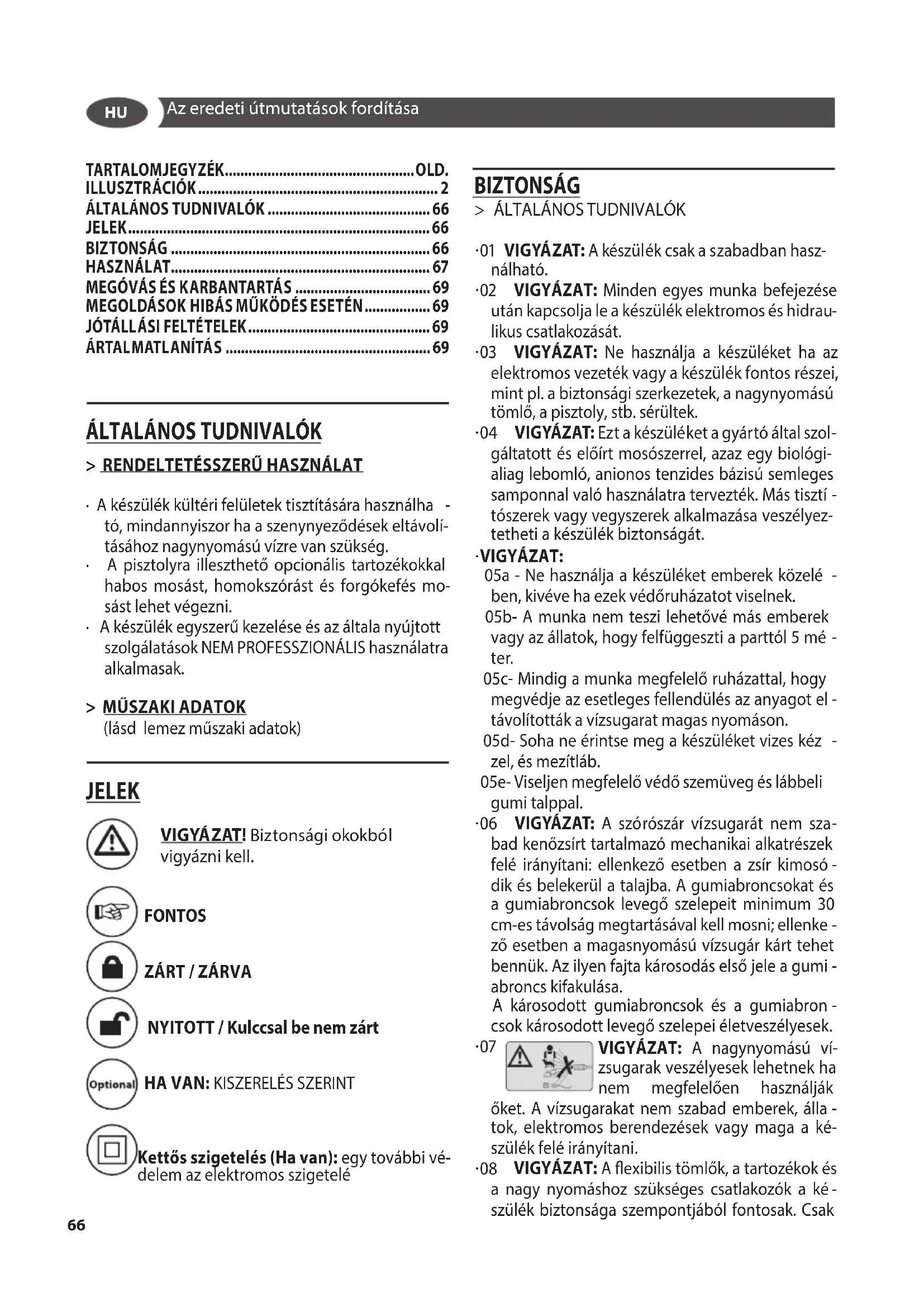 - 03 VIGYÁZAT: Ne használja a készüléket ha az elektromos vezeték vagy a készülék fontos részei, mint pl. a biztonsági szerkezetek, a nagynyomású tömlő, a pisztoly, stb. sérültek.