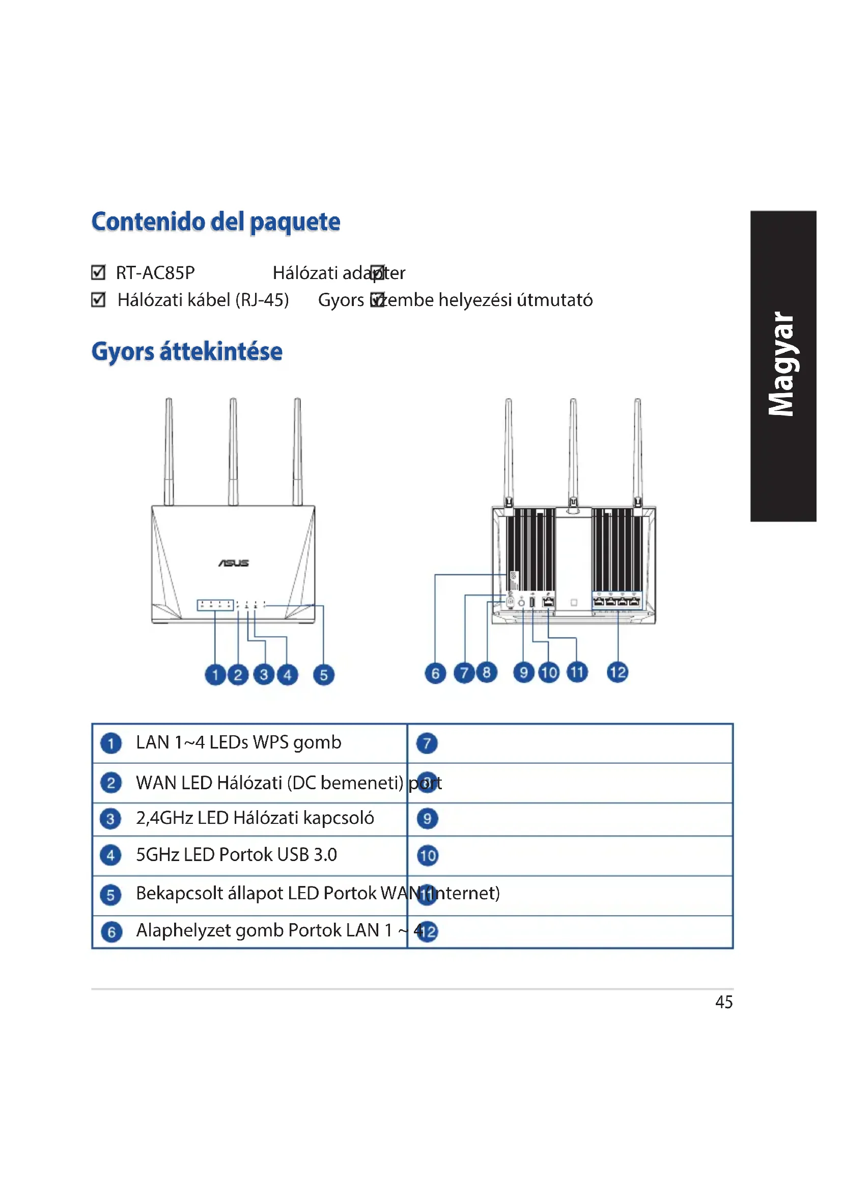 https://www.asus.com/support :רתאהמ שמתשמל ךירדמה תא דירוהל רשפא •45 Magyar Gyors áttekintése Contenido del paquete RT-AC85P Hálózati adapter Hálózati kábel (RJ-45) Gyors üzembe helyezési útmutató LAN 1~4 LEDs WPS gomb WAN LED Hálózati (DC bemeneti) port 2,4GHz LED Hálózati kapcsoló 5GHz LED Portok USB 3.0 Bekapcsolt állapot LED Portok WAN (Internet) Alaphelyzet gomb Portok LAN 1 ~ 446 Magyar A router elhelyezése A vezeték nélküli router és a hálózati eszközök közötti legjobb vezeték nélküli jelátvitel érdekében gondoskodjon a következőkről: