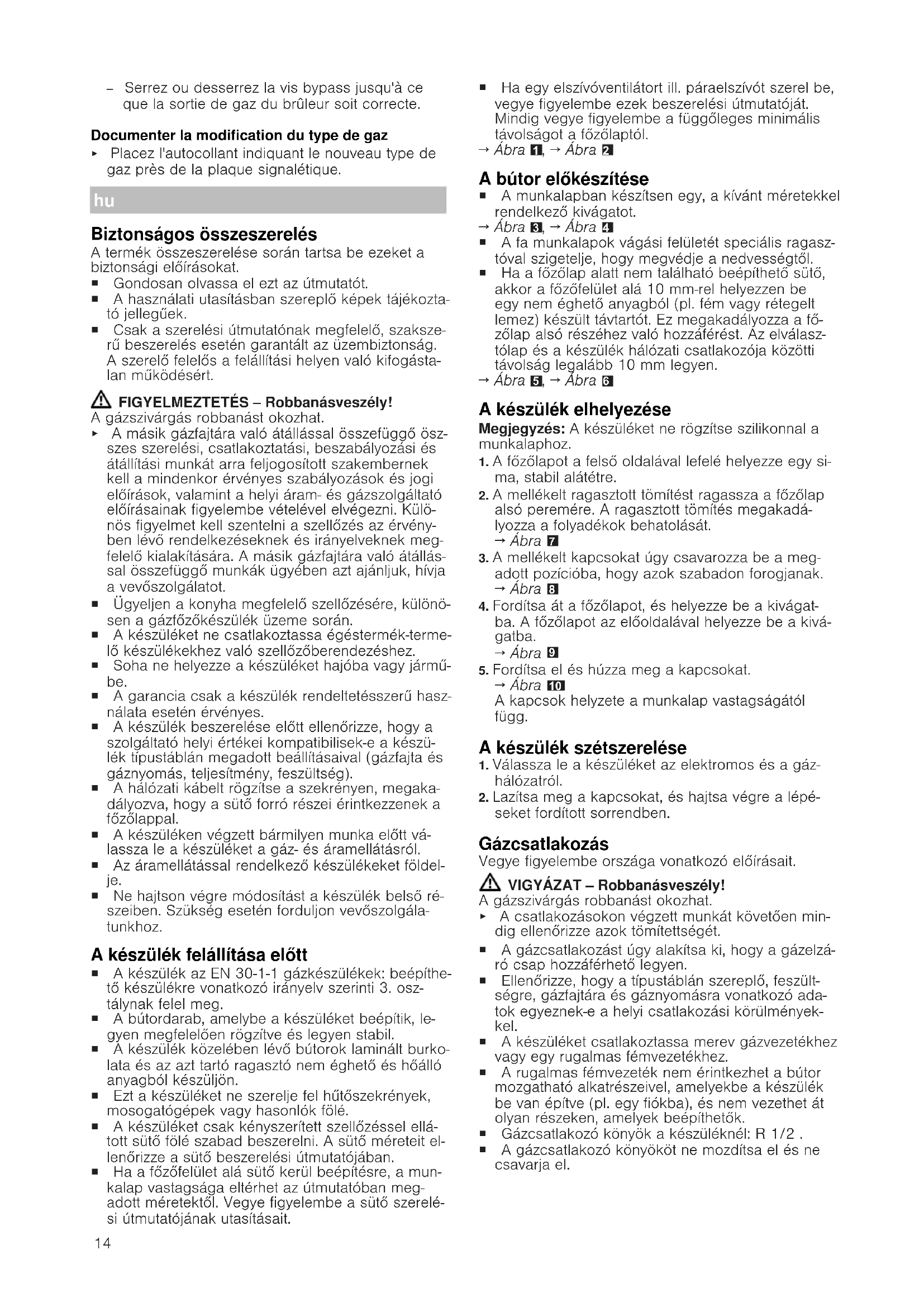 Biztonságos összeszerelés A termék összeszerelése során tartsa be ezeket a biztonsági előírásokat. ¡ Gondosan olvassa el ezt az útmutatót. ¡ A használati utasításban szereplő képek tájékozta- tó jellegűek. ¡ Csak a szerelési útmutatónak megfelelő, szaksze- rű beszerelés esetén garantált az üzembiztonság. A szerelő felelős a felállítási helyen való kifogásta- lan működésért. FIGYELMEZTETÉS‒Robbanásveszély! A gázszivárgás robbanást okozhat. ▶ A másik gázfajtára való átállással összefüggő ösz- szes szerelési, csatlakoztatási, beszabályozási és átállítási munkát arra feljogosított szakembernek kell a mindenkor érvényes szabályozások és jogi előírások, valamint a helyi áram- és gázszolgáltató előírásainak figyelembe vételével elvégezni. Külö- nös figyelmet kell szentelni a szellőzés az érvény- ben lévő rendelkezéseknek és irányelveknek meg- felelő kialakítására. A másik gázfajtára való átállás- sal összefüggő munkák ügyében azt ajánljuk, hívja a vevőszolgálatot. ¡ Ügyeljen a konyha megfelelő szellőzésére, különö- sen a gázfőzőkészülék üzeme során. ¡ A készüléket ne csatlakoztassa égéstermék-terme- lő készülékekhez való szellőzőberendezéshez. ¡ Soha ne helyezze a készüléket hajóba vagy jármű- be. ¡ A garancia csak a készülék rendeltetésszerű hasz- nálata esetén érvényes. ¡ A készülék beszerelése előtt ellenőrizze, hogy a szolgáltató helyi értékei kompatibilisek-e a készü- lék típustáblán megadott beállításaival (gázfajta és gáznyomás, teljesítmény, feszültség). ¡ A hálózati kábelt rögzítse a szekrényen, megaka- dályozva, hogy a sütő forró részei érintkezzenek a főzőlappal. ¡ A készüléken végzett bármilyen munka előtt vá- lassza le a készüléket a gáz- és áramellátásról. ¡ Az áramellátással rendelkező készülékeket földel- je. ¡ Ne hajtson végre módosítást a készülék belső ré- szeiben. Szükség esetén forduljon vevőszolgála- tunkhoz. A készülék felállítása előtt ¡ A készülék az EN 30-1-1 gázkészülékek: beépíthe- tő készülékre vonatkozó irányelv szerinti 3. osz- tálynak felel meg. ¡ A bútordarab, amelybe a készüléket beépítik, le- gyen megfelelően rögzítve és legyen stabil. ¡ A készülék közelében lévő bútorok laminált burko- lata és az azt tartó ragasztó nem éghető és hőálló anyagból készüljön. ¡ Ezt a készüléket ne szerelje fel hűtőszekrények, mosogatógépek vagy hasonlók fölé. ¡ A készüléket csak kényszerített szellőzéssel ellá- tott sütő fölé szabad beszerelni. A sütő méreteit el- lenőrizze a sütő beszerelési útmutatójában. ¡ Ha a főzőfelület alá sütő kerül beépítésre, a mun- kalap vastagsága eltérhet az útmutatóban meg- adott méretektől. Vegye figyelembe a sütő szerelé- si útmutatójának utasításait. ¡ Ha egy elszívóventilátort ill. páraelszívót szerel be, vegye figyelembe ezek beszerelési útmutatóját. Mindig vegye figyelembe a függőleges minimális távolságot a főzőlaptól.