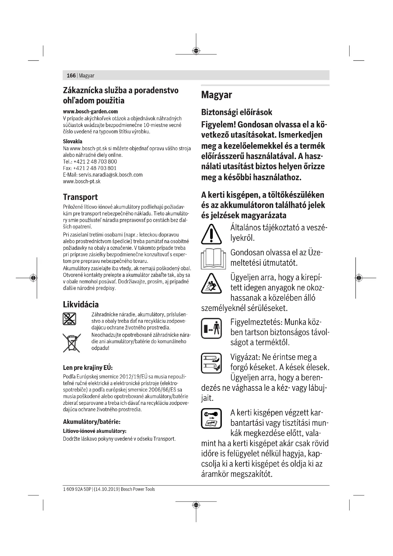 Aby ste zvýšili dobu použitia kosačky, môžete si v autorizova- nom servisnom stredisku pre záhradné náradie Bosch zakú- piť ďalší akumulátor. Hľadanie porúch Symptóm Možná príčina Odstránenie príčiny Motor sa nerozbehne Vnútorná kabeláž záhradníckeho náradia je poru- šená Obráťte sa na autorizované servisné stredisko Bosch Akumulátor je vybitý Dobite akumulátor Akumulátor je príliš studený/horúci Akumulátor zahrejte/nechajte vychladnúť Tráva je príliš vysoká Maximálna prípustná výška trávy je 30 cm pri naj- vyššom nastavení pracovnej výšky nožov 1 609 92A 5BP | (14.10.2019) Bosch Power ToolsSlovenčina | 165 Symptóm Možná príčina Odstránenie príčiny Motorový istič sa inicioval Nechajte motor vychladnúť a nastavte väčšiu pracovnú výšku nožov Odpojovač elektrického obvodu nebol vložený správne/nebol vložený úplne Vložte správne Záhradnícke náradie beží prerušovane Vnútorná kabeláž záhradníckeho náradia je poru- šená Obráťte sa na autorizované servisné stredisko Bosch Motorový istič sa inicioval Nechajte motor vychladnúť a nastavte väčšiu pracovnú výšku nožov Záhradné náradie zanecháva nepravidel- ne pokosený trávnik a/alebo motor pracuje ťažkor Výška rezu je príliš nízka Nastavte väčšiu výšku rezu Nôž je tupý Vymeňte nôž (pozri obrázok J) Náradie môže byť upchaté (zablokované) Náradie vypnite a uvoľnite odpojovač elektrické- ho obvodu Skontrolujte dolnú stranu náradia a v prípade po- treby ju uvoľnite - vyčistite (pracujte pritom vždy s pracovnými rukavicami) Nôž je namontovaný nesprávne Premontujte nôž do správnej polohy Po zapnutí záhradníc- keho náradia sa nôž ne- otáča Nôž je zablokovaný trávou Náradie vypnite a uvoľnite odpojovač elektrické- ho obvodu Uvoľnite blokovanie (pracujte pritom vždy s pracovnými rukavicami) Matica noža/skrutka noža je uvoľnená Utiahnite maticu/skrutku noža (27Nm) Silné vibrácie/hluk Matica noža/skrutka noža je uvoľnená Utiahnite maticu/skrutku noža (27Nm) Nôž je poškodený Vymeňte nôž (pozri obrázok J) Akumulátor a nabíjačka Symptómy Možná príčina Odstránenie príčiny Červená indikácia nabí- jania akumulátora bliká Nabíjanie nie je možné Akumulátor nie je vložený (správne) Nasaďte akumulátor správne do nabíjačky Kontakty akumulátora sú znečistené Očistite kontakty akumulátora; napríklad viac- násobným zasunutím a vysunutím akumulátora, prípadne akumulátor vymeňte za nový Akumulátor je poškodený Akumulátor vymeňte za nový Indikácia nabíjania aku- mulátora na nabíjačke nesvieti Zástrčka nabíjačky nie je (nie je správne) zasunu- tá do zásuvky Zástrčku sieťovej šnúry zasuňte do zásuvky (úpl- ne) Zásuvka, sieťová šnúra alebo nabíjačka je po- škodená Skontrolujte sieťové napätie, nabíjačku dajte prípadne preskúšať v autorizovanej servisnej opravovni ručného elektrického náradia Bosch Údržba a servis Ošetrovanie akumulátora u Pozor! Pred každou údržbou a pred každým čistením náradie vypnite, uvoľnite odpojovač elektrického ob- vodu a demontujte z náradia akumulátor a takisto zbe- rací kôš na trávu. u Keď s niečím manipulujete, alebo keď niečo robíte v priestore ostrých nožov, používajte vždy záhradnícke pracovné rukavice. Aby ste dosiahli optimálne využitie akumulátora, dodržiavaj- te nasledujúce pokyny a opatrenia: – Chráňte akumulátor pred vlhkosťou a vodou. – Skladujte toto záhradné náradie pri rozsahu teploty od -20°C do 50 °C. Nenechávajte napríklad ležať záhradné náradie v lete v motorovom vozidle. – Akumulátor skladujte osobitne a nie v náradí. – Ak svieti na záhradnícke náradie priame slnečné svetlo, nenechávajte akumulátor v náradí. – Optimálna teplota na skladovanie akumulátora je 5 °C. – Príležitostne prečistite vetracie štrbiny akumulátora jem- ným, čistým a suchým štetcom. Výrazne skrátená prevádzková doba akumulátora po jeho dobití signalizuje, že akumulátor je opotrebovaný a treba ho vymeniť za nový. Bosch Power Tools 1 609 92A 5BP | (14.10.2019)166 | Magyar Zákaznícka služba aporadenstvo ohľadom použitia www.bosch-garden.com Vprípade akýchkoľvek otázok aobjednávok náhradných súčiastok uvádzajte bezpodmienečne 10‑miestne vecné číslo uvedené na typovom štítku výrobku. Slovakia Na www.bosch-pt.sk si môžete objednať opravu vášho stroja alebo náhradné diely online. Tel.: +421 2 48 703 800 Fax: +421 2 48 703 801 E-Mail: servis.naradia@sk.bosch.com www.bosch-pt.sk Transport Priložené lítiovo-iónové akumulátory podliehajú požiadav- kám pre transport nebezpečného nákladu. Tieto akumuláto- ry smie používateľ náradia prepravovať po cestách bez ďal- ších opatrení. Pri zasielaní tretími osobami (napr.: leteckou dopravou alebo prostredníctvom špedície) treba pamätať na osobitné požiadavky na obaly a označenie. V takomto prípade treba pri príprave zásielky bezpodmienečne konzultovať s exper- tom pre prepravu nebezpečného tovaru. Akumulátory zasielajte iba vtedy, ak nemajú poškodený obal. Otvorené kontakty prelepte a akumulátor zabaľte tak, aby sa v obale nemohol posúvať. Dodržiavajte, prosím, aj prípadné ďalšie národné predpisy. Likvidácia Záhradnícke náradie, akumulátory, príslušen- stvo a obaly treba dať na recykláciu zodpove- dajúcu ochrane životného prostredia. Neodhadzujte opotrebované záhradnícke nára- die ani akumulátory/batérie do komunálneho odpadu! Len pre krajinyEÚ: Podľa Európskej smernice 2012/19/EÚ sa musia nepouži- teľné ručné elektrické a elektronické prístroje (elektro- spotrebiče) a podľa európskej smernice 2006/66/ES sa musia poškodené alebo opotrebované akumulátory/batérie zbierať separovane a treba ich dávať na rec