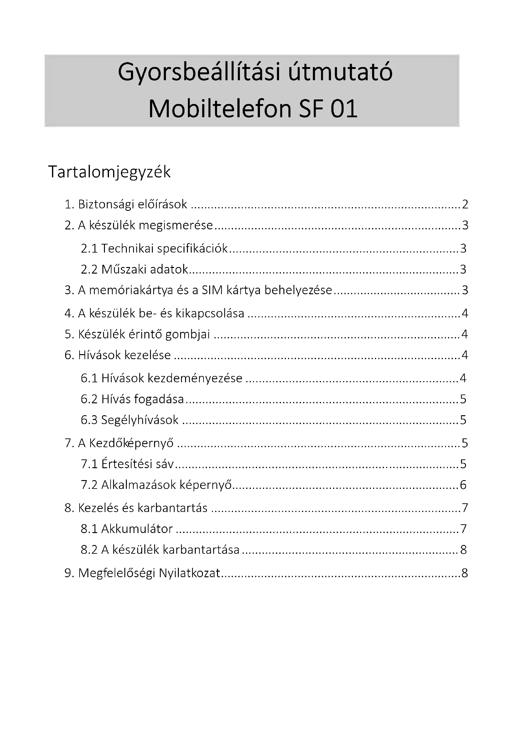 Designed and Engineered by Blaupunkt Competence Center Mobile Europe HTM Mobile Kft. 1118 Budapest, Dayka Gábor utca 3. Hungary Assembled in P.R.C by ZECHIN Communication (HK) Limited Flat/RM 3 C27/F, Ho King Comm, Centre No.2-16 Fa Yuen Street Mongkok, KL, Hong Kong A készülékkel kapcsolatos bővebb információért, keresse fel honlapunkat: www.htmmobile.hu vagy www.blaupunkt.com Google Android, a Google Play és az egyéb jelölések a Google Inc. védjegyeiGhid de instalare rapidă Telefon mobil SF 01 Cuprins