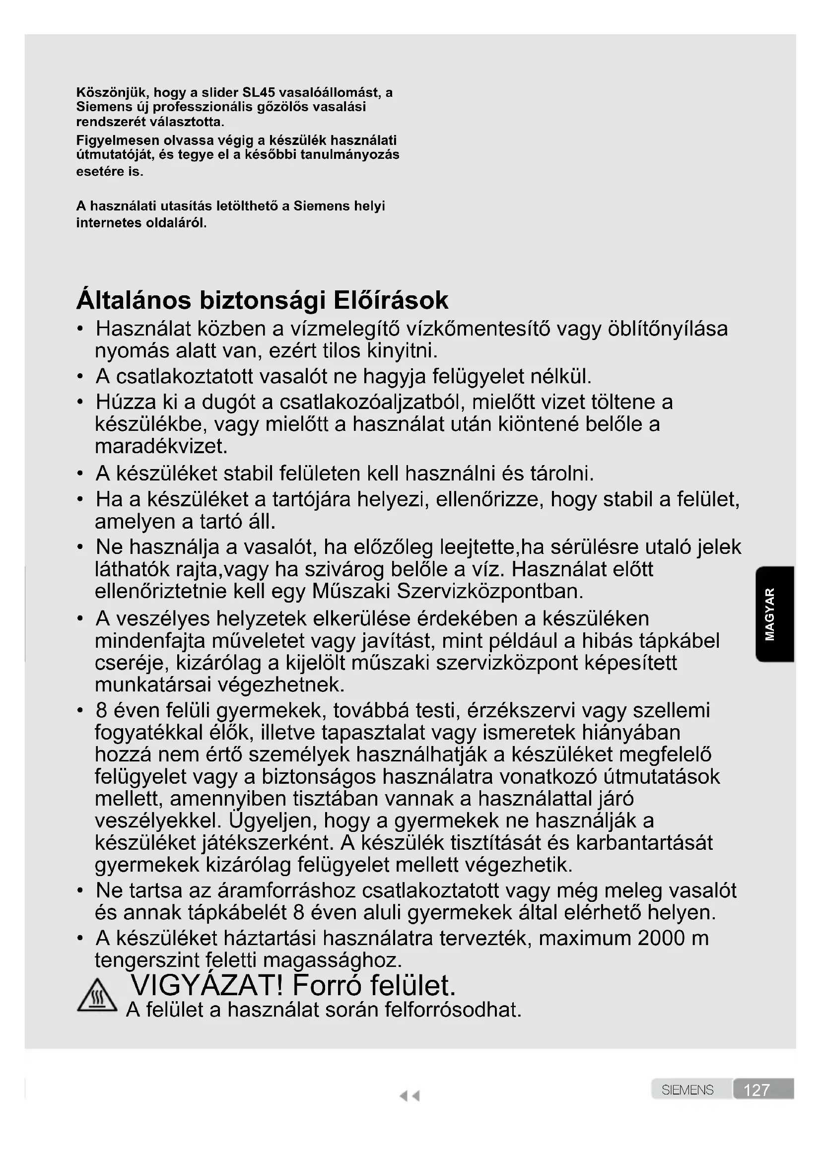 - Wystarczy ponownie nacisnąć na spust i żelazko od razu przestanie uwalniać parę. Jeżeli problem, który wystąpił, nie jest opisany w powyższej tabeli, należy skontaktować się z autoryzowanym serwisem technicznym.127 S I E M E N SMAGYAR Köszönjük, hogy a slider SL45 vasalóállomást, a Siemens új professzionális gőzölős vasalási rendszerét választotta. Figyelmesen olvassa végig a készülék használati útmutatóját, és tegye el a későbbi tanulmányozás esetére is. A használati utasítás letölthető a Siemens helyi internetes oldaláról. Általános biztonsági Előírások