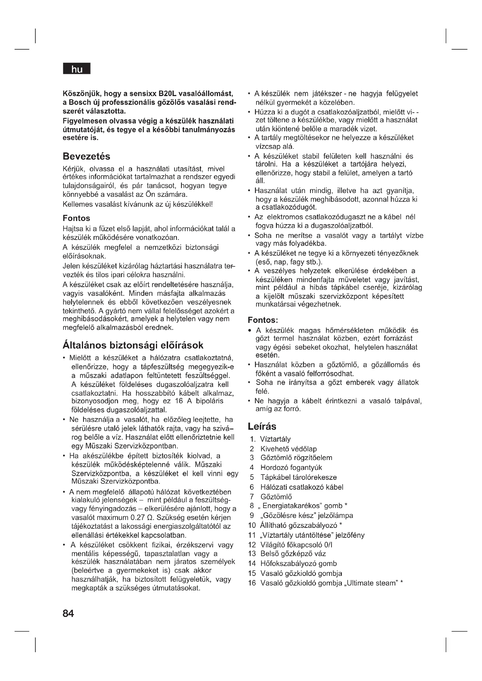 sításának EUszerte érvényes kereteit határozza meg. Probléma Lehetséges okok Megoldás Vízfoltok jelennek meg a ruhán vasalás közben. A vasalódeszkán lecsapódott gőz okozhatja. Törölje le a vasalódeszka huzatát, és szárítsa meg a foltokat a vasalóval, gőz nélkül. Vízfoltok jelennek meg a ruhán az „Ultimate steam” funkció használatakor. A vízfoltokat a használat utáni lehűléskor a tömlőben lecsapódó gőz okozza. Az „Ultimate steam” funkció használata során egy idő után már nem jelennek meg vízcseppek a vasalótalpon. A gőztömlő használat közben felforrósodik. Ez normális jelenség. A gőzölős vasalás során a tömlőn áthaladó gőz okozza. Helyezze át a tömlőt a másik oldalra, hogy ne érjen hozzá vasalás közben. A vasalódeszkára helyezett vasaló folyamatosan gőzöl. Bekapcsolta a „Pulse steam” funkciót két kattintással. Nyomja meg ismét a gombot, és a vasaló azonnal abbahagyja a gőzölést. Ha a fent említettek nem oldják meg a gondot, lépjen kapcsolatba egy minősített Javítóközponttal. AhasználatiutasításletölthetőaBoschhelyiinternetesoldaláról.90 Дякуємо Вам за придбання парової станції sensixxB20Lпрофесійногокласу,новоїсистеми дляпрасуваннязпароювідBosch. Уважно прочитайте інструкцію з експлуатації даногопристроютазбережітьїїнамайбутнє.