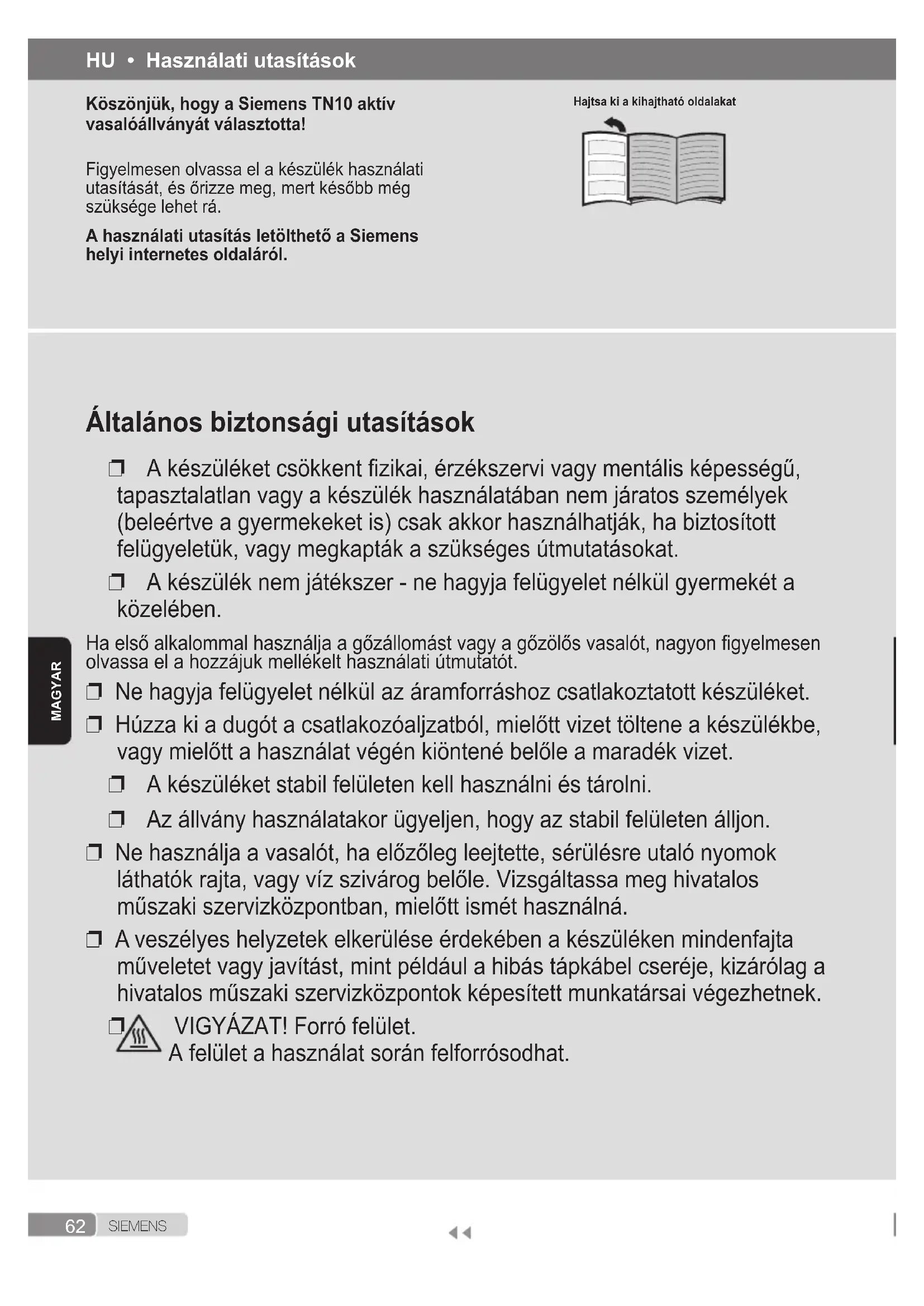 VIGYÁZAT! Forró felület. A felület a használat során felforrósodhat. HU • Használati utasítások Köszönjük, hogy a Siemens TN10 aktív vasalóállványát választotta! Figyelmesen olvassa el a készülék használati utasítását, és őrizze meg, mert később még szüksége lehet rá. A használati utasítás letölthető a Siemens helyi internetes oldaláról.63 S I E M E N S magYar Fontos gyelmeztetések