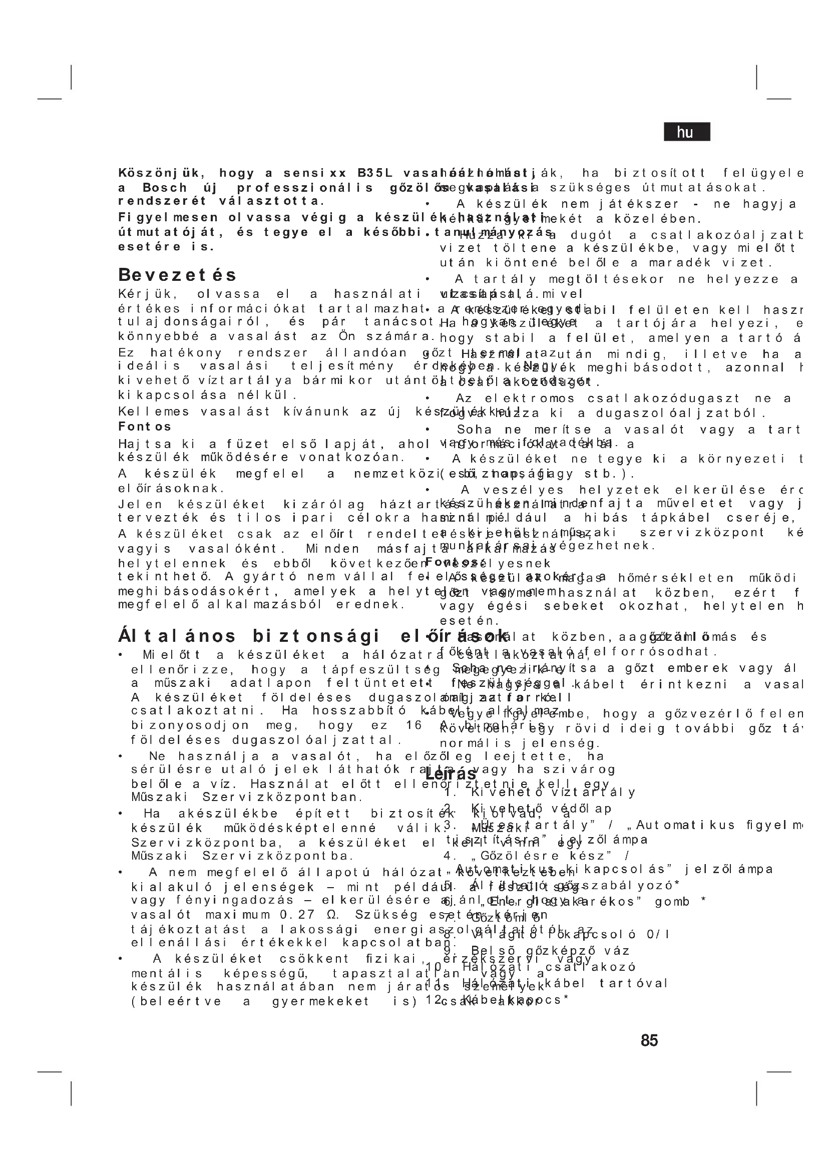 Wyczyśﻼ stopę wilgotną ściereczką elazko nie przestaje uwalniaﻼ pary po odstawieniu go na podstawkę. Funkcja “Inteligentna kontrola pary” jest wﻡączona. Wystarczy ponownie nacisnąﻼ na spust i elazko od razu przestanie uwalniaﻼ parę. Urządzenie wydaje dwięk pompowania. Woda jest przepompowywana do generatora pary. Dwięk nie ustaje. Jest to normalne. Jeśli dwięk nie ustaje, nie uywaj generatora pary i skontaktuj się z autoryzowanym serwisem technicznym. Spadek ciśnienia pary podczas prasowania Przycisk uwalniania pary pozostaje przyciśnięty przez dﻡuszy czas Naciśnij przycisk uwalniania pary (15) co pewien czas. Poprawia to efekty prasowania, poniewa materiaﻡ będzie lepiej wysuszony i uzyska większą miękkośﻼ Wyciek wody z parownika Korek spustowy znajdujący się na dnie urządzenia jest poluzowany. Dokręﻼ korek spustowy parownika monetą. Jeśli powysze porady nie pomagają usunąﻼproblemu, skontaktuj się z autoryzowanym serwisem technicznym. Ten podręcznik mona pobraﻼ z lokalnej strony internetowej firmy Bosch.85 Köszönjük, hogy a sensixx B35L vasalóállomást, a Bosch új professzionális gőzölős vasalási rendszerét választotta. Figyelmesen olvassa végig a készülék használati útmutatóját, és tegye el a későbbi tanulmányozás esetére is. Bevezetés Kérjük, olvassa el a használati utasítást, mivel értékes információkat tartalmazhat a rendszer egyedi tulajdonságairól, és pár tanácsot, hogyan tegye könnyebbé a vasalást az Ön számára. Ez hatékony rendszer állandóan gőzt termel az ideális vasalási teljesítmény érdekében. Nagy, kivehető víztartálya bármikor utántölthető a rendszer kikapcsolása nélkül. Kellemes vasalást kívánunk az új készülékkel! Fontos Hajtsa ki a füzet első lapját, ahol információkat talál a készülék működésére vonatkozóan. A készülék megfelel a nemzetközi biztonsági előírásoknak. Jelen készüléket kizárólag háztartási használatra tervezték és tilos ipari célokra használni. A készüléket csak az előírt rendeltetésére használja, vagyis vasalóként. Minden másfajta alkalmazás helytelennek és ebből következően veszélyesnek tekinthető. A gyártó nem vállal felelősséget azokért a meghibásodásokért, amelyek a helytelen vagy nem megfelelő alkalmazásból erednek. Általános biztonsági előírások Mielőtt a készüléket a hálózatra csatlakoztatná, ellenőrizze, hogy a tápfeszültség megegyezik-e a műszaki adatlapon feltüntetett feszültséggel. A készüléket földeléses dugaszolóaljzatra kell csatlakoztatni. Ha hosszabbító kábelt alkalmaz, bizonyosodjon meg, hogy ez 16 A bipoláris földeléses dugaszolóaljzattal. Ne használja a vasalót, ha előzőleg leejtette, ha sérülésre utaló jelek láthatók rajta, vagy ha szivárog belőle a víz. Használat előtt ellenőriztetnie kell egy Műszaki Szervizközpontban. Ha akészülékbe épített biztosíték kiolvad, a készülék működésképtelenné válik. Műszaki Szervizközpontba, a készüléket el kell vinni egy Műszaki Szervizközpontba. A nem megfelelő állapotú hálózat következtében kialakuló jelenségek – mint például a feszültség- vagy fényingadozás – elkerülésére ajánlott, hogy a vasalót maximum 0.27 Ω. Szükség esetén kérjen tájékoztatást a lakossági energiaszolgáltatótól az ellenállási értékekkel kapcsolatban. A készüléket csökkent fizikai, érzékszervi vagy mentális képességű, tapasztalatlan vagy a készülék használatában nem járatos személyek (beleértve a gyermekeket is) csak akkor használhatják, ha biztosított felügyeletük, vagy megkapták a szükséges útmutatásokat. A készülék nem játékszer - ne hagyja felügyelet nélkül gyermekét a közelében. Húzza ki a dugót a csatlakozóaljzatból, mielőtt vizet töltene a készülékbe, vagy mielőtt a használat után kiöntené belőle a maradék vizet. A tartály megtöltésekor ne helyezze a készüléket vízcsap alá. A készüléket stabil felületen kell használni és tárolni. Ha a készüléket a tartójára helyezi, ellenőrizze, hogy stabil a felület, amelyen a tartó áll. Használat után mindig, illetve ha azt gyanítja, hogy a készülék meghibásodott, azonnal húzza ki a csatlakozódugót. Az elektromos csatlakozódugaszt ne a kábel nél fogva húzza ki a dugaszolóaljzatból. Soha ne merítse a vasalót vagy a tartályt vízbe vagy más folyadékba. A készüléket ne tegye ki a környezeti tényezőknek (eső, nap, fagy stb.). A veszélyes helyzetek elkerülése érdekében a készüléken mindenfajta műveletet vagy javítást, mint például a hibás tápkábel cseréje, kizárólag a kijelölt műszaki szervizközpont képesített munkatársai végezhetnek. Fontos: A készülék magas hőmérsékleten működik és gőzt termel használat közben, ezért forrázást vagy égési sebeket okozhat, helytelen használat esetén. Használat közben a gőztömlő , a gőzállomás és főként a vasaló felforrósodhat. Soha ne irányítsa a gőzt emberek vagy állatok felé. Ne hagyja a kábelt érintkezni a vasaló talpával, amíg az forró. Vegye figyelembe, hogy a gőzvezérlő felengedését követően, egy rövid ideig további gőz távozhat. Ez normális jelenség. Leírás