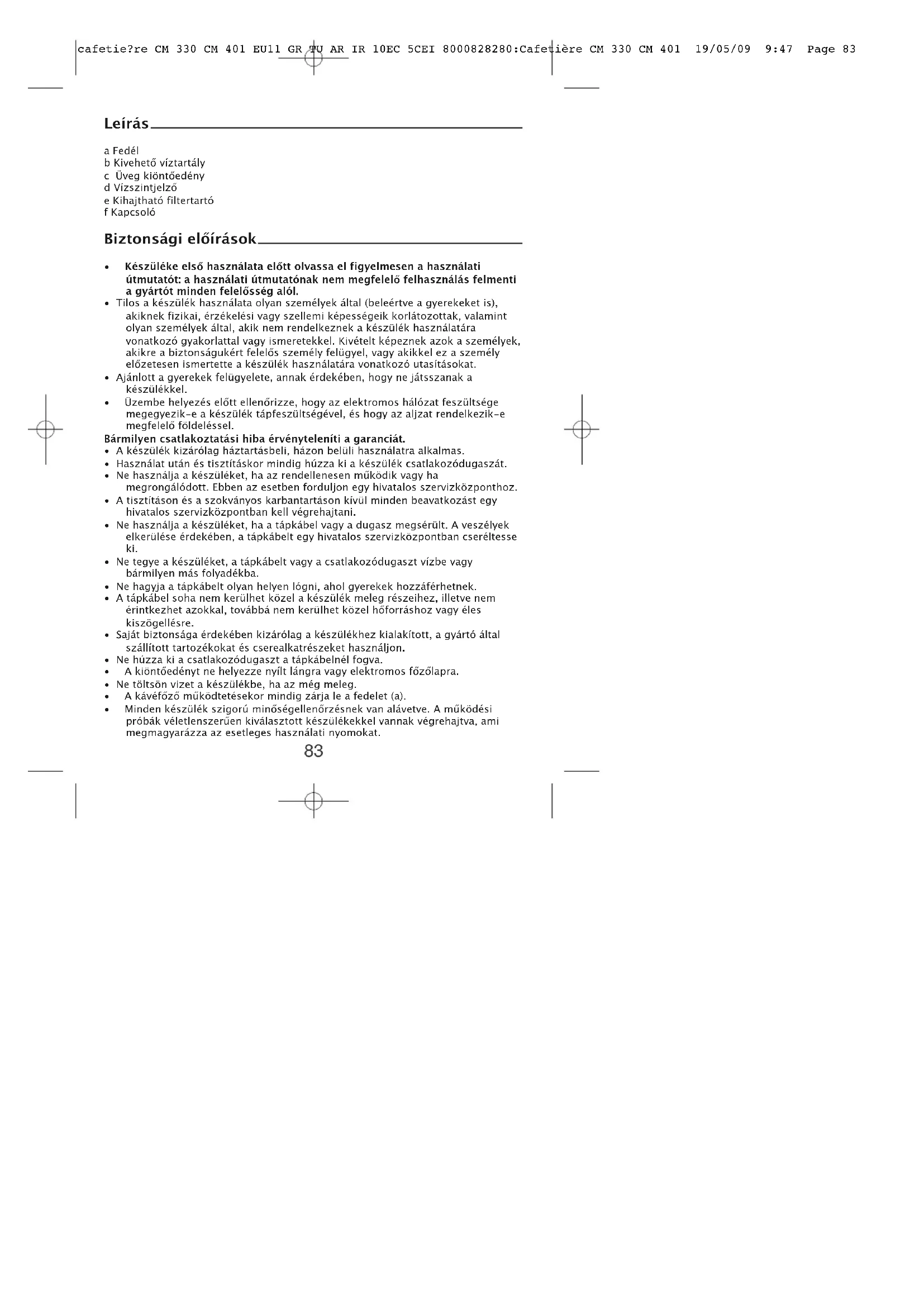 cafetie?re CM 330 CM 401 EU11 GR TU AR IR 10EC 5CEI 8000828280:Cafetière CM 330 CM 401 19/05/09 9:47 Page 82Leírás a Fedél b Kivehető víztartály c Üveg kiöntőedény d Vízszintjelző e Kihajtható filtertartó f Kapcsoló Biztonsági előírások