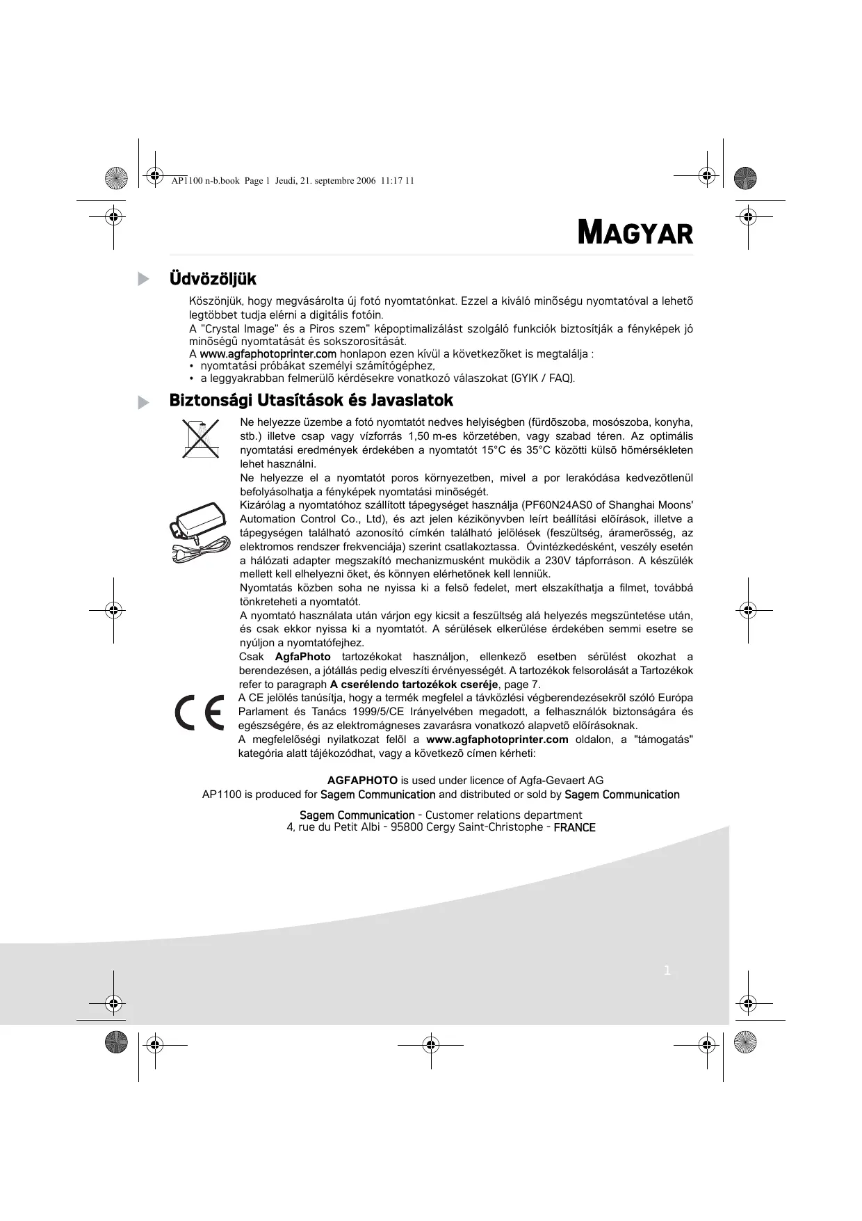 Biztonsági Utasítások és Javaslatok Ne helyezze üzembe a fotó nyomtatót nedves helyiségben (fürdõszoba, mosószoba, konyha, stb.) illetve csap vagy vízforrás 1,50 m-es körzetében, vagy szabad téren. Az optimális nyomtatási eredmények érdekében a nyomtatót 15°C és 35°C közötti külsõ hõmérsékleten lehet használni. Ne helyezze el a nyomtatót poros környezetben, mivel a por lerakódása kedvezõtlenül befolyásolhatja a fényképek nyomtatási minõségét. Kizárólag a nyomtatóhoz szállított tápegységet használja (PF60N24AS0 of Shanghai Moons' Automation Control Co., Ltd), és azt jelen kézikönyvben leírt beállítási elõírások, illetve a tápegységen található azonosító címkén található jelölések (feszültség, áramerõsség, az elektromos rendszer frekvenciája) szerint csatlakoztassa. Óvintézkedésként, veszély esetén a hálózati adapter megszakító mechanizmusként muködik a 230V tápforráson. A készülék mellett kell elhelyezni õket, és könnyen elérhetõnek kell lenniük. Nyomtatás közben soha ne nyissa ki a felsõ fedelet, mert elszakíthatja a filmet, továbbá tönkreteheti a nyomtatót. A nyomtató használata után várjon egy kicsit a feszültség alá helyezés megszüntetése után, és csak ekkor nyissa ki a nyomtatót. A sérülések elkerülése érdekében semmi esetre se nyúljon a nyomtatófejhez. Csak AgfaPhoto tartozékokat használjon, ellenkezõ esetben sérülést okozhat a berendezésen, a jótállás pedig elveszíti érvényességét. A tartozékok felsorolását a Tartozékok refer to paragraph A cserélendo tartozékok cseréje, page 7. A CE jelölés tanúsítja, hogy a termék megfelel a távközlési végberendezésekrõl szóló Európa Parlament és Tanács 1999/5/CE Irányelvében megadott, a felhasználók biztonságára és egészségére, és az elektromágneses zavarásra vonatkozó alapvetõ elõírásoknak. A megfelelõségi nyilatkozat felõl a www.agfaphotoprinter.com oldalon, a "támogatás" kategória alatt tájékozódhat, vagy a következõ címen kérheti: AGFAPHOTO is used under licence of Agfa-Gevaert AG AP1100 is produced for Sagem Communication and distributed or sold by Sagem Communication Sagem Communication - Customer relations department 4, rue du Petit Albi - 95800 Cergy Saint-Christophe - FRANCE