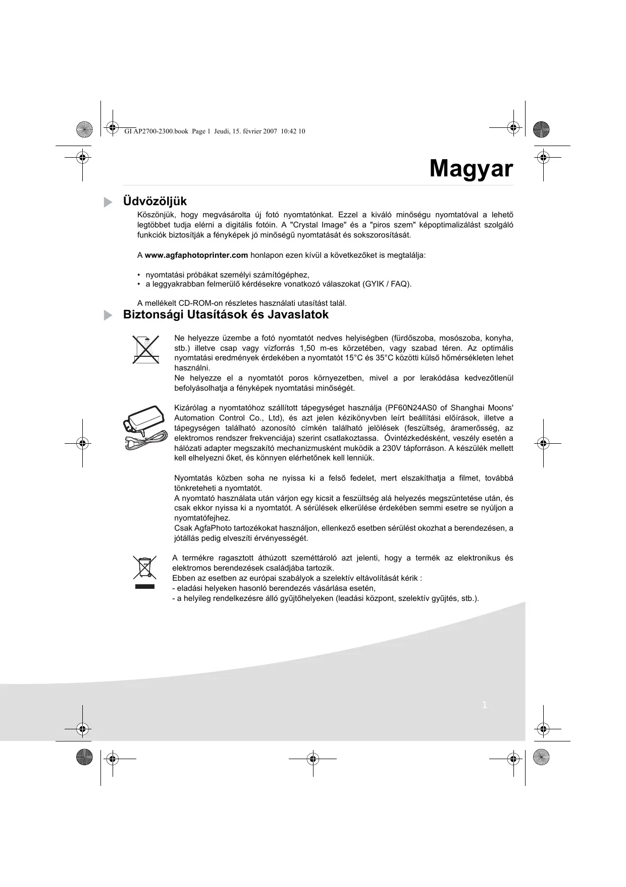 Biztonsági Utasítások és Javaslatok Ne helyezze üzembe a fotó nyomtatót nedves helyiségben (fürdőszoba, mosószoba, konyha, stb.) illetve csap vagy vízforrás 1,50 m-es körzetében, vagy szabad téren. Az optimális nyomtatási eredmények érdekében a nyomtatót 15°C és 35°C közötti külső hőmérsékleten lehet használni. Ne helyezze el a nyomtatót poros környezetben, mivel a por lerakódása kedvezőtlenül befolyásolhatja a fényképek nyomtatási minőségét. Kizárólag a nyomtatóhoz szállított tápegységet használja (PF60N24AS0 of Shanghai Moons' Automation Control Co., Ltd), és azt jelen kézikönyvben leírt beállítási előírások, illetve a tápegységen található azonosító címkén található jelölések (feszültség, áramerősség, az elektromos rendszer frekvenciája) szerint csatlakoztassa. Óvintézkedésként, veszély esetén a hálózati adapter megszakító mechanizmusként muködik a 230V tápforráson. A készülék mellett kell elhelyezni őket, és könnyen elérhetőnek kell lenniük. Nyomtatás közben soha ne nyissa ki a felső fedelet, mert elszakíthatja a filmet, továbbá tönkreteheti a nyomtatót. A nyomtató használata után várjon egy kicsit a feszültség alá helyezés megszüntetése után, és csak ekkor nyissa ki a nyomtatót. A sérülések elkerülése érdekében semmi esetre se nyúljon a nyomtatófejhez. Csak AgfaPhoto tartozékokat használjon, ellenkező esetben sérülést okozhat a berendezésen, a jótállás pedig elveszíti érvényességét. A termékre ragasztott áthúzott szeméttároló azt jelenti, hogy a termék az elektronikus és elektromos berendezések családjába tartozik. Ebben az esetben az európai szabályok a szelektív eltávolítását kérik : - eladási helyeken hasonló berendezés vásárlása esetén, - a helyileg rendelkezésre álló gyűjtőhelyeken (leadási központ, szelektív gyűjtés, stb.).