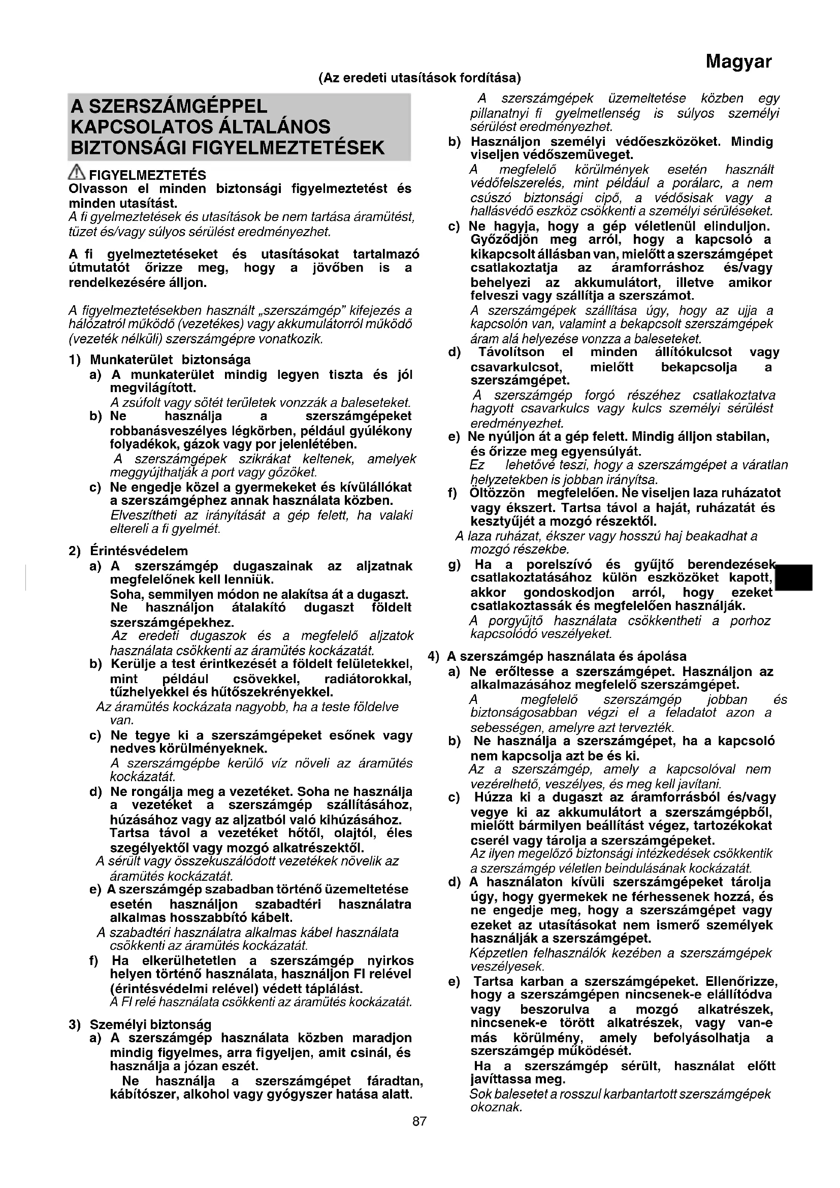 FIGYELMEZTETÉS Olvasson el minden biztonsági fi gyelmeztetést és minden utasítást. A fi gyelmeztetések és utasítások be nem tartása áramütést, tüzet és/vagy súlyos sérülést eredményezhet. A fi gyelmeztetéseket és utasításokat tartalmazó útmutatót őrizze meg, hogy a jövőben is a rendelkezésére álljon. A fi gyelmeztetésekben használt „szerszámgép” kifejezés a hálózatról működő (vezetékes) vagy akkumulátorról működő (vezeték nélküli) szerszámgépre vonatkozik.