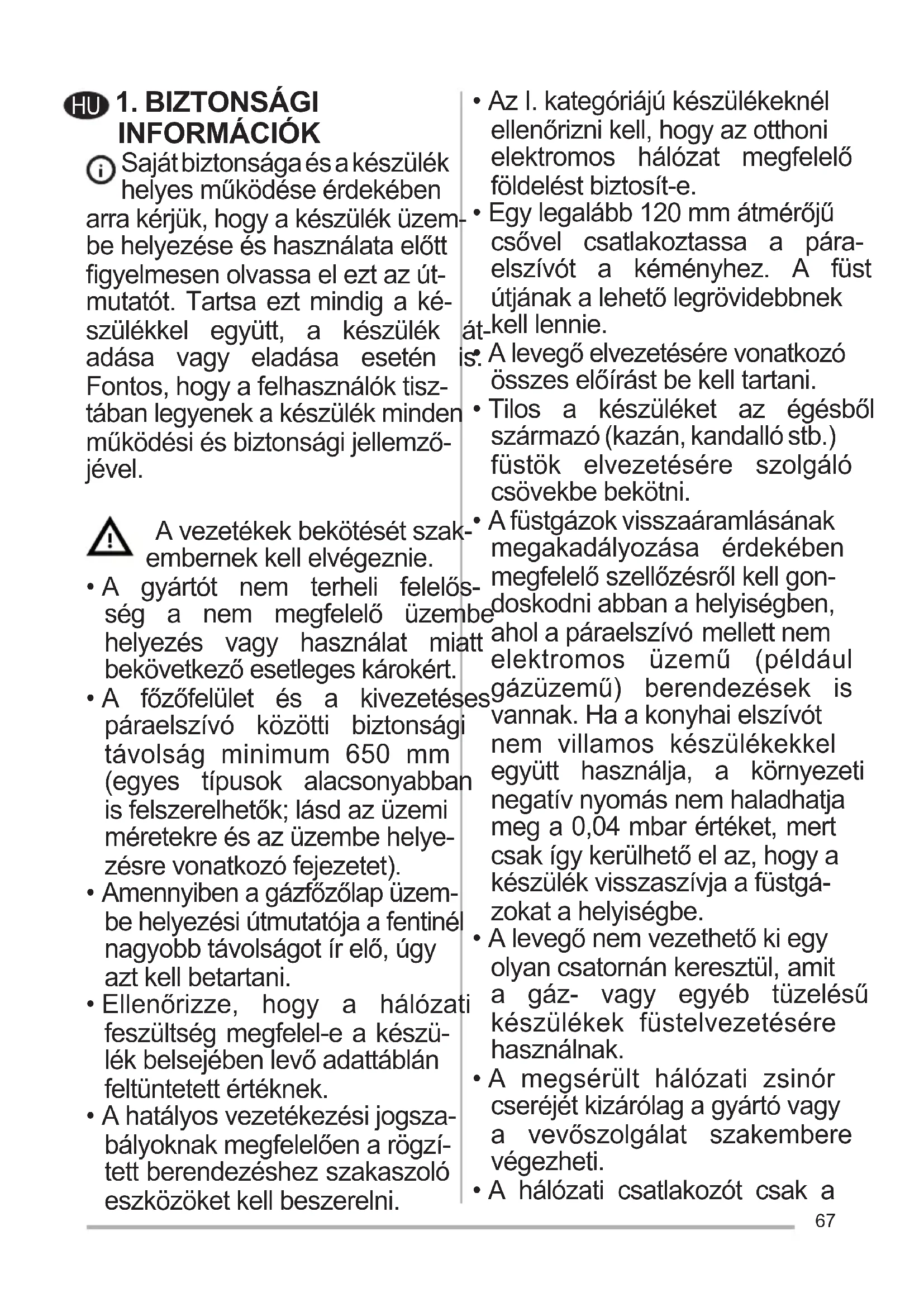 - A füstelvezetésre vonatkozó műszakiésbiztonságiteendőket illetőenfontosahelyihatóságok által előírt szabályok szigorú betartása. FIGYELMEZTETÉS: az el- szívóüzembehelyezéseelőtt elkelltávolítaniavédőfóliá- kat.