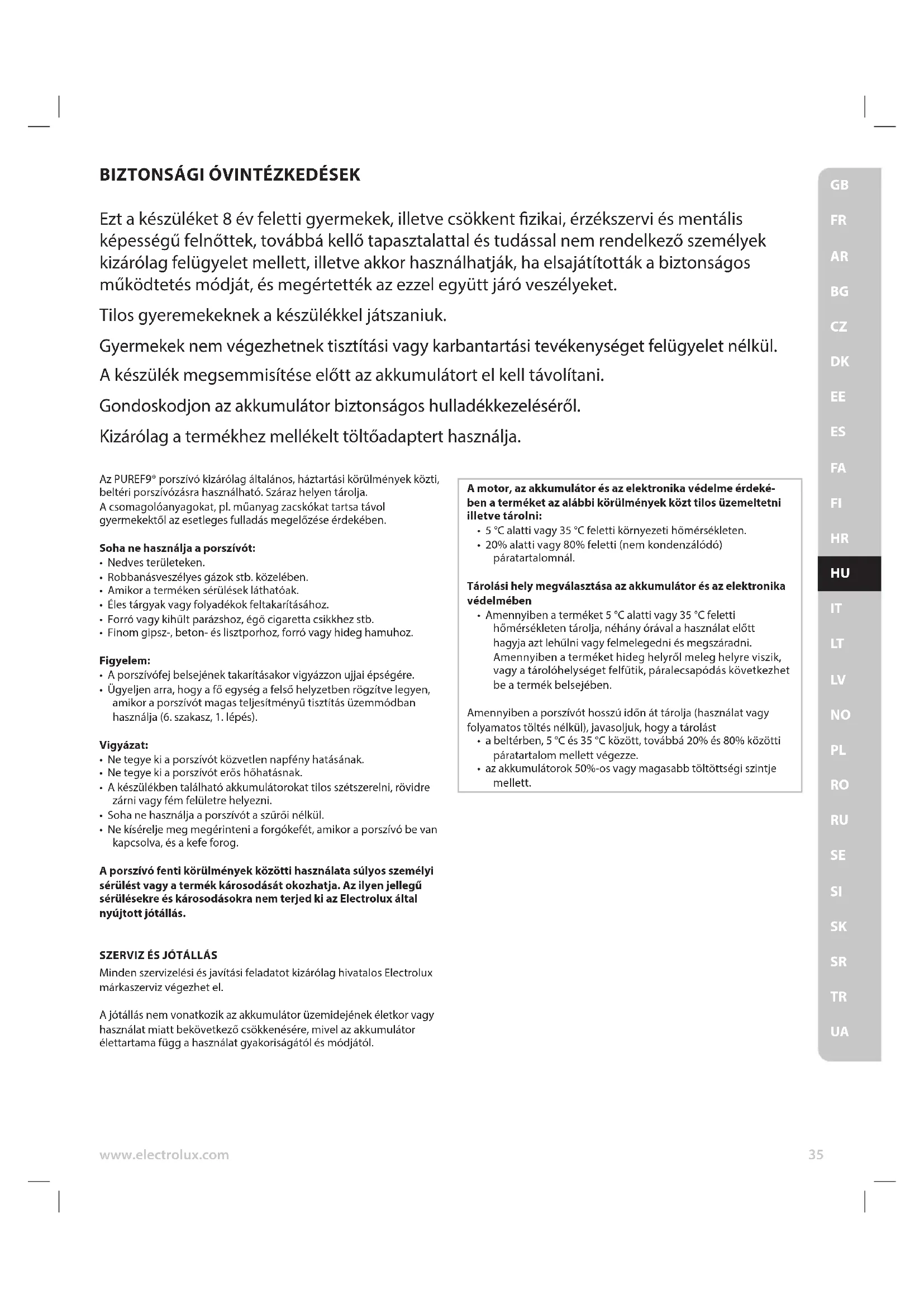 36V 32,4 V Magas teljesítményű üzemmód Kb. 17 min* Kb. 15 min* Normál üzemmód Kb. 30 min* Kb. 25 min* Hosszú üzemidejű üzemmód Kb. 60 min* Kb. 55 min* *az Electrolux belső tesztje alapján Ez a garancia nem vonatkozik az akkumlátor használatából vagy korából adódó kapacitás csökkenésre, mivel az a has- ználat gyakoriságán és természetén alapul. Ez a szimbólum azt jelzi, hogy a készülékben elem/ akkumulátor van, ami nem helyezhető a háztartási hulladék közé. A terméken, illetve annak csomagolásán látható szimbólum azt jelzi, hogy a készülék a szokásos háztartási hulladékoktól elkülönítve kezelendő. Kérjük, vigye el a terméket egy kijelölt gyűjtőhelyre, vagy az Electrolux egyik márkaszervizébe az akkumulátor és az elektromos alkatrészek biztonságos, szakszerű eltávolítása és megfelelő újrahasznosítása érdekében. Minden esetben tartsa be az elektromos készülékek és a tölthető elemek / akkumulátorok elkülönített hulladékkezelésére vonatkozó nemzeti előírásokat.