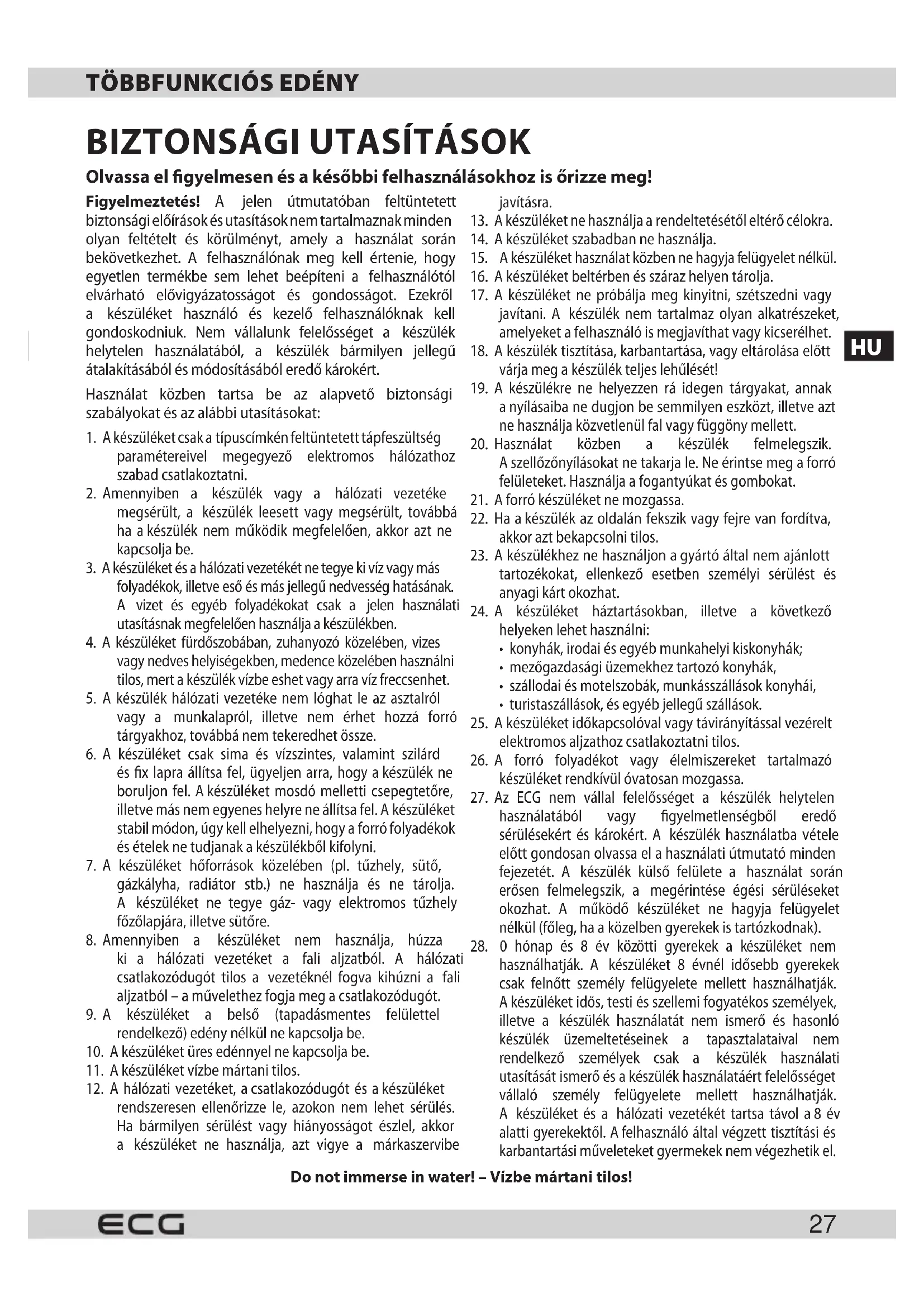 Az edény térfogata 3 l Névleges feszültség: 220 – 240 V~ 50/60 Hz Névleges teljesítményfelvétel: 900 W GARANCIA: akövetkező használati mód agarancia megszűnését jelenti. A készüléket szakszerűtlenül és nem ahasználati útmutató szerint, illetve arendeltetésétől eltérő célokra használták. Akészüléket nagy erővel nyomták. Akészüléket nem amárkaszerviz javította meg. Akészüléket átalakították. A használatból eredő kopásoknak kitett alkatrészekre agarancia nem vonatkozik. HULLADÉKFELHASZNÁLÁS ÉS MEGSEMMISÍTÉS A csomagolópapírt és hullámpapírt adja le hulladékgyűjtő telepen. Csomagolófólia, PE zacskók, műanyag alkatrészek – műanyaggyűjtő szelektív hulladéktároló edénybe. ÉLETTARTAM LEJÁRTÁT KÖVETŐ MEGSEMMISÍTÉS Használt elektromos és elektronikus készülékek megsemmisítése (érvényes az EU tagállamokban és számos szelektív hulladékgyűjtést végző európai országban) Ez a terméken vagy csomagolásán található jelzés azt mutatja, hogy a terméket tilos standard háztartási hulladékként megsemmisíteni. A terméket elektromos és elektronikus berendezések újrahasznosítására szakosodott hulladékgyűjtő telepen adja le. A termék helyes megsemmisítésével megelőzi, hogy káros hatást fejtsen ki az emberi egészségre és környezetünkre. Az anyagok újrahasznosítása kíméli a természetes forrásainkat. A termék újrahasznosításával kapcsolatosan bővebb információkat a helyi önkormányzattól, aháztartási hulladékot feldolgozó szervezettől, vagy a termék forgalmazójától kérhet. Ez a termék megfelel a kisfeszültségű berendezések biztonságára és az elektromágneses kompatibilitásra vonatkozó EU irányelveknek. A készülék használati útmutatója a www.ecg-electro.eu oldalon található. A szöveg és a műszaki paraméterek megváltoztatásának a joga fenntartva. 08/05DE MULTIFUNKTIONSKOCHTOPF